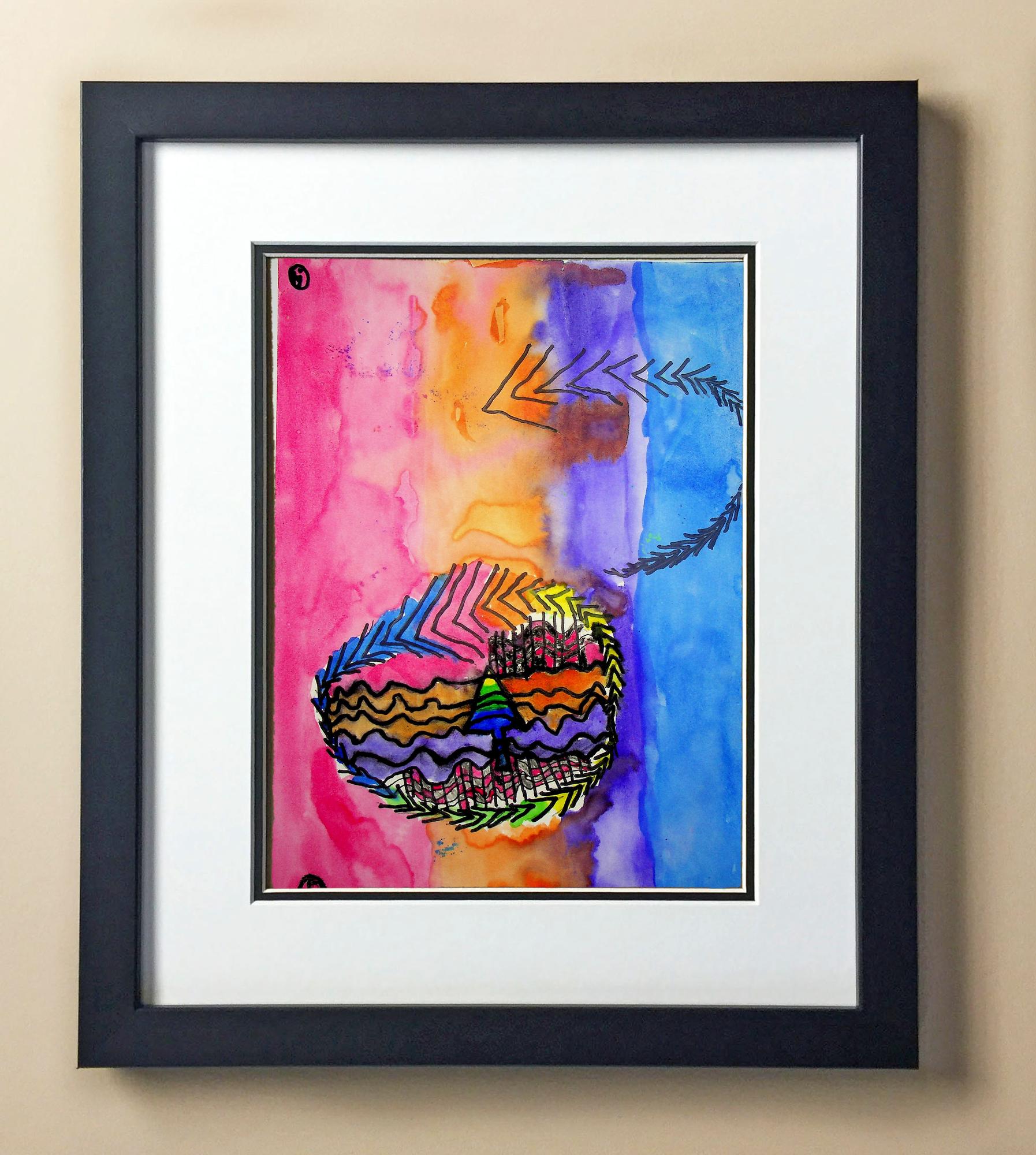 Included with the purchase is the Students Artwork, Frame, double matboard, shatter proof plexiglass, and a ready to hang backerboard with turnbuttons