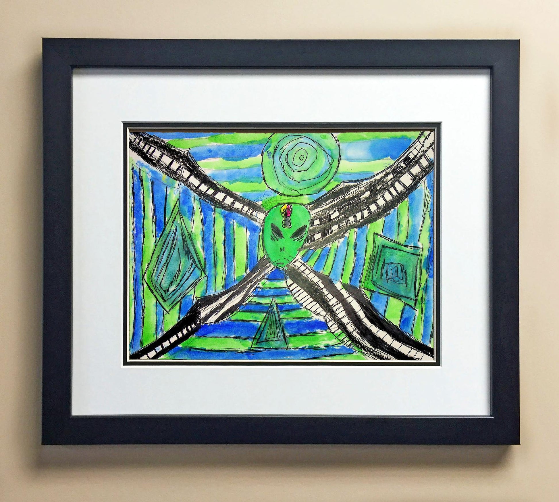 Included with the purchase is the Students Artwork, Frame, double matboard, shatter proof plexiglass, and a ready to hang backerboard with turnbuttons