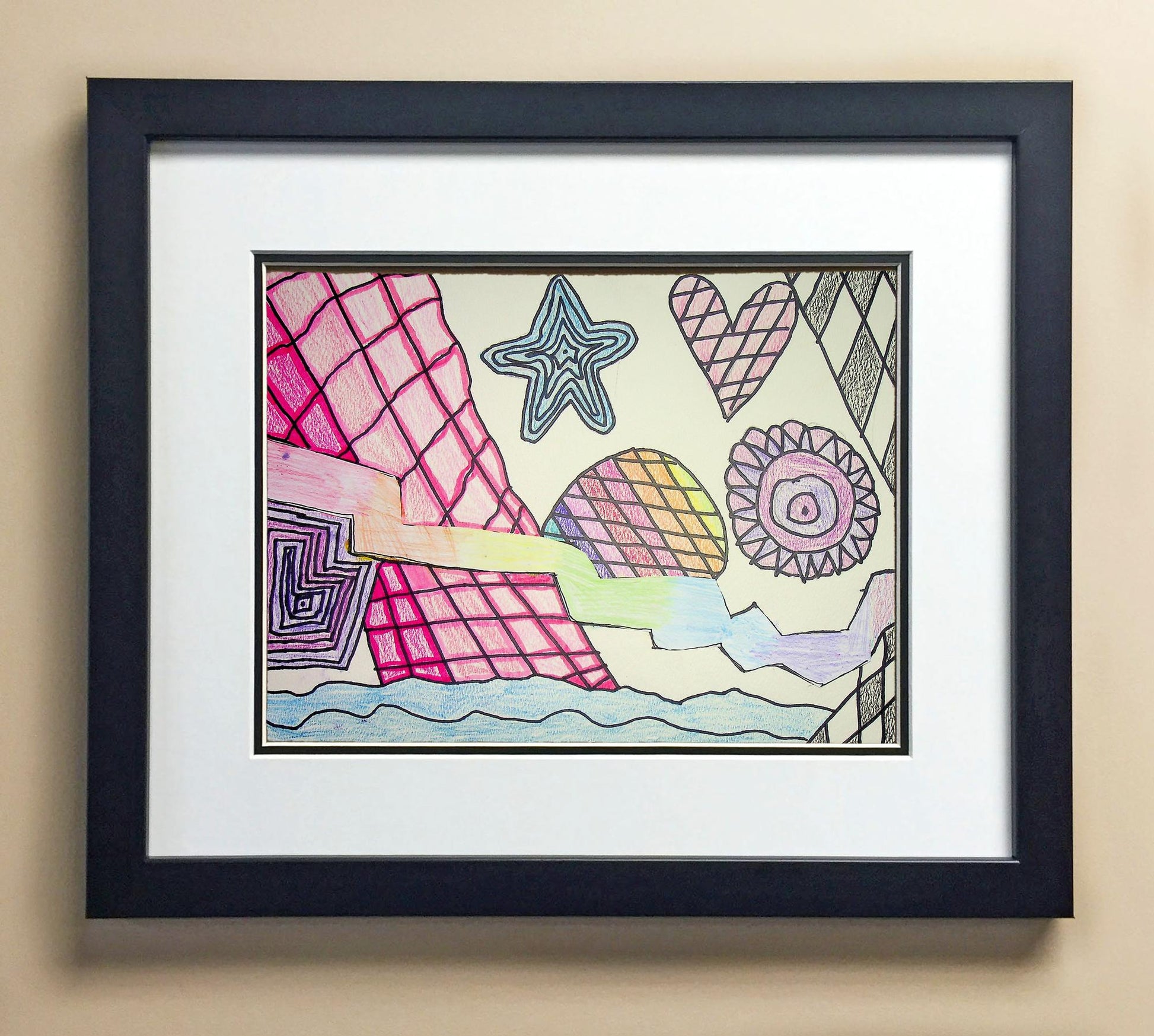 Included with the purchase is the Students Artwork, Frame, double matboard, shatter proof plexiglass, and a ready to hang backerboard with turnbuttons