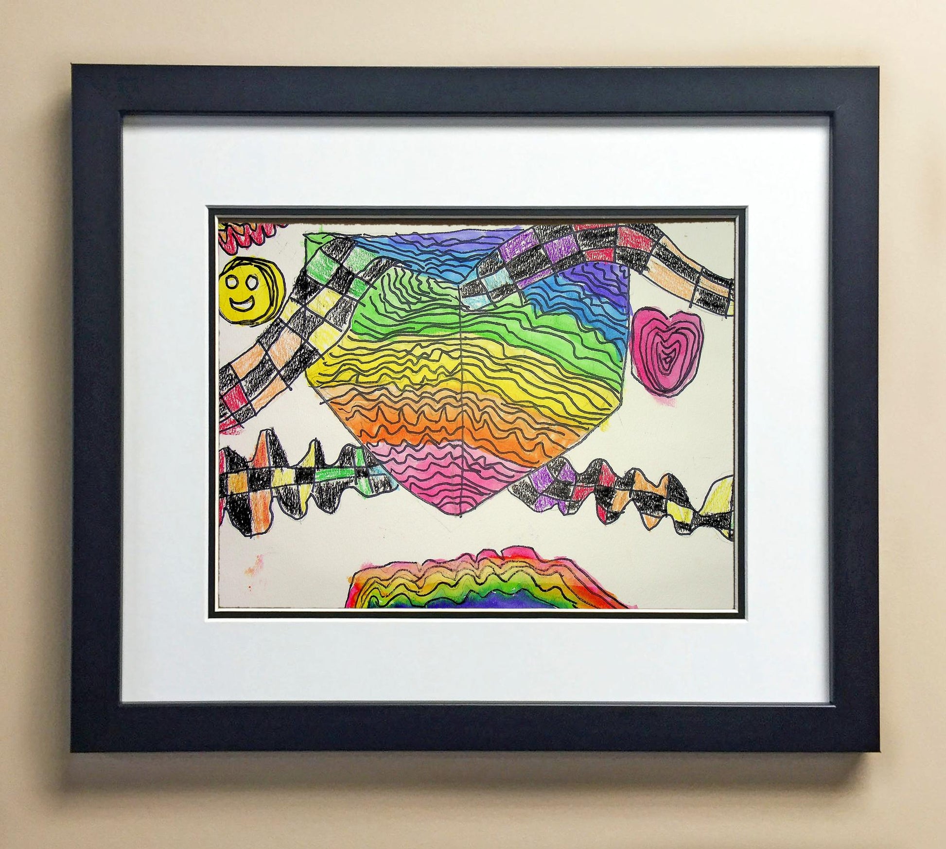 Included with the purchase is the Students Artwork, Frame, double matboard, shatter proof plexiglass, and a ready to hang backerboard with turnbuttons
