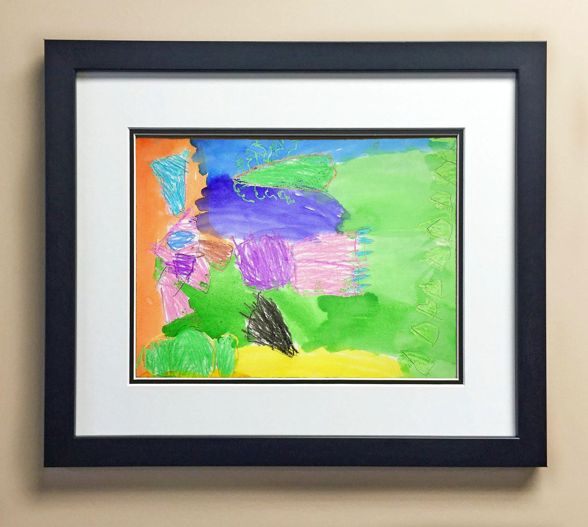 Included with the purchase is the Students Artwork, Frame, double matboard, shatter proof plexiglass, and a ready to hang backerboard with turnbuttons