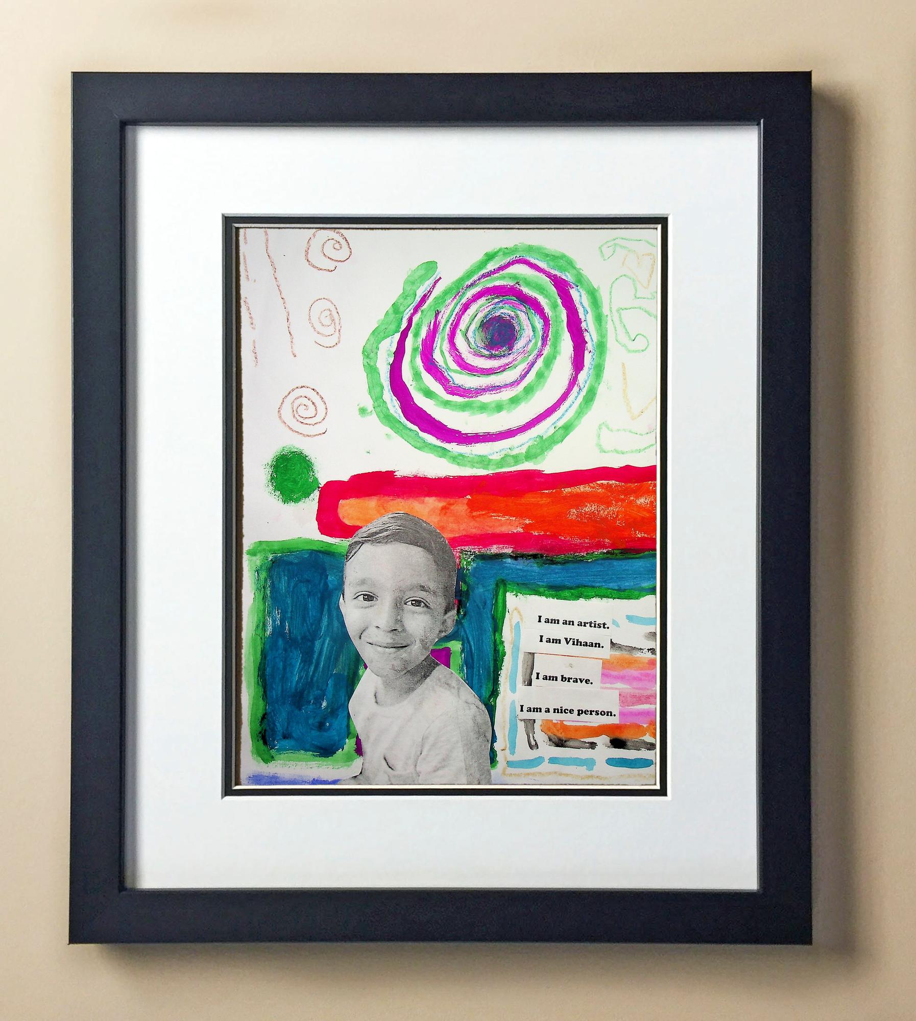 Included with the purchase is the Students Artwork, Frame, double matboard, shatter proof plexiglass, and a ready to hang backerboard with turnbuttons