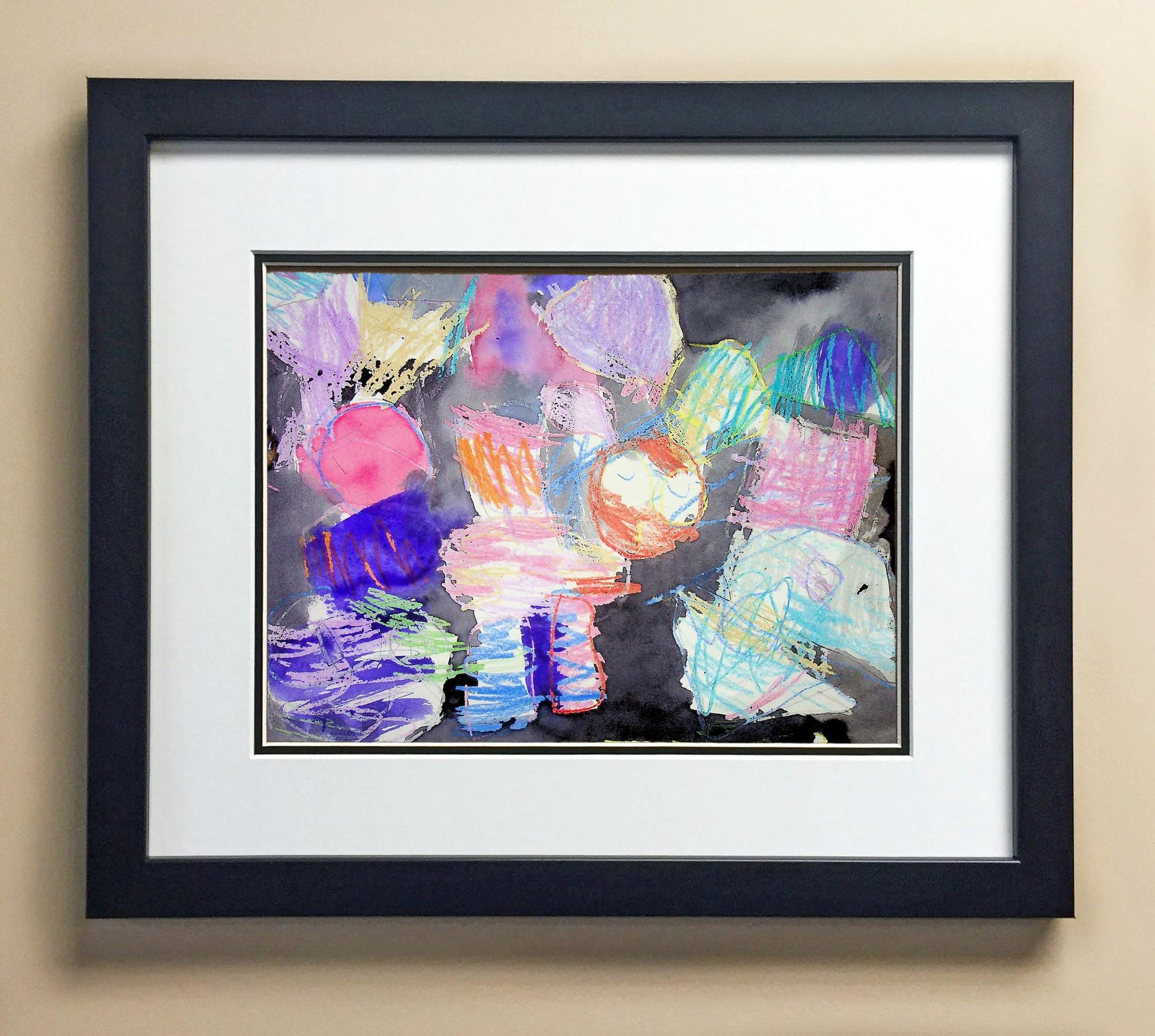 Included with the purchase is the Students Artwork, Frame, double matboard, shatter proof plexiglass, and a ready to hang backerboard with turnbuttons
