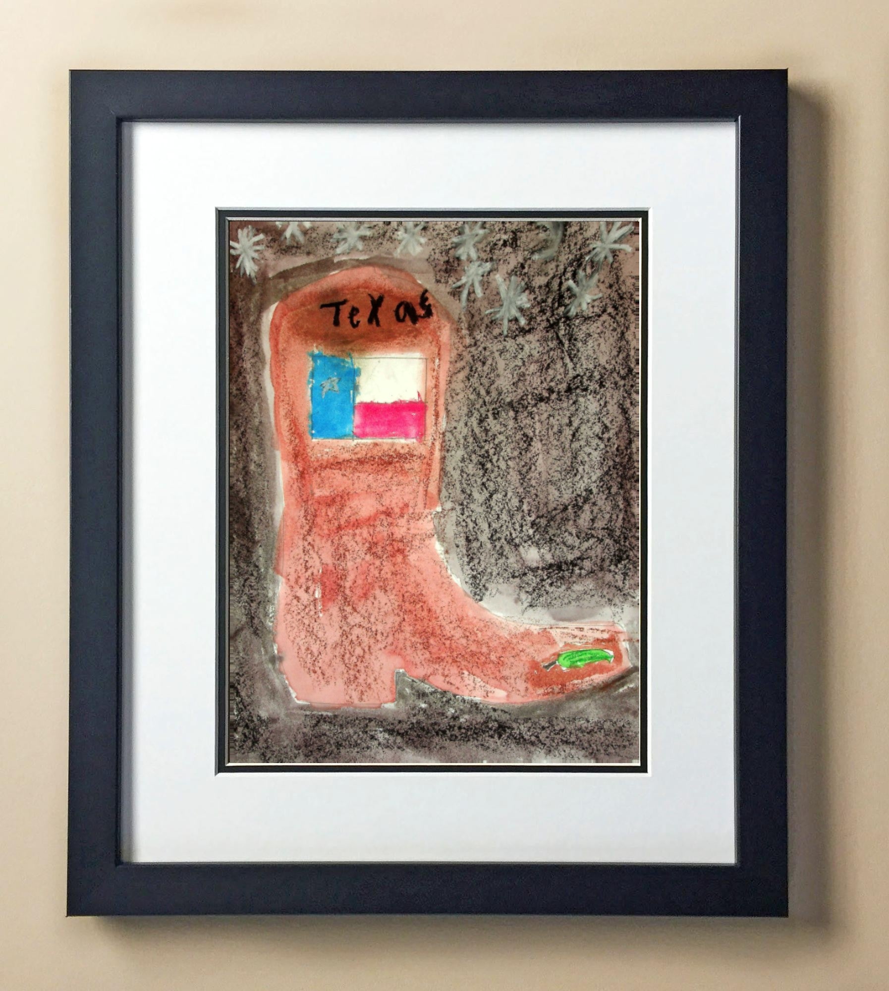 Included with the purchase is the Students Artwork, Frame, double matboard, shatter proof plexiglass, and a ready to hang backerboard with turnbuttons