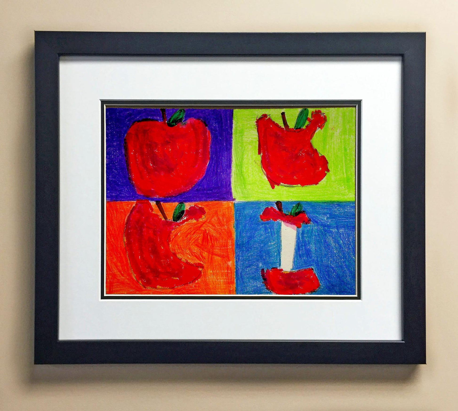 Included with the purchase is the Students Artwork, Frame, double matboard, shatter proof plexiglass, and a ready to hang backerboard with turnbuttons