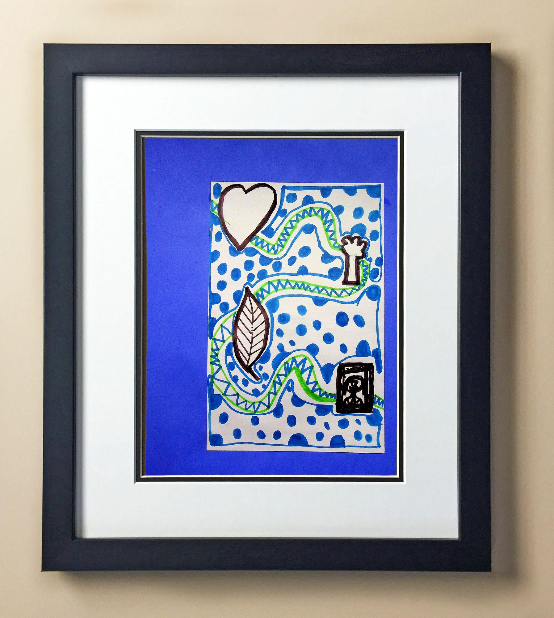 Included with the purchase is the Students Artwork, Frame, double matboard, shatter proof plexiglass, and a ready to hang backerboard with turnbuttons