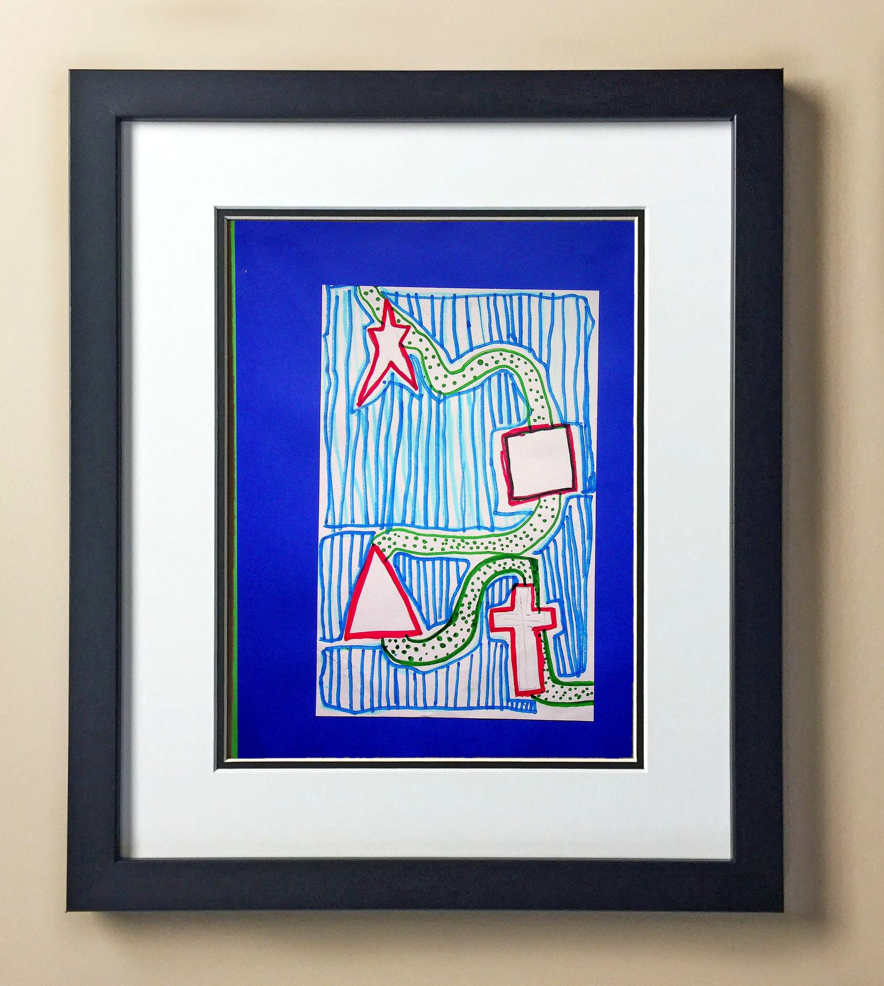 Included with the purchase is the Students Artwork, Frame, double matboard, shatter proof plexiglass, and a ready to hang backerboard with turnbuttons