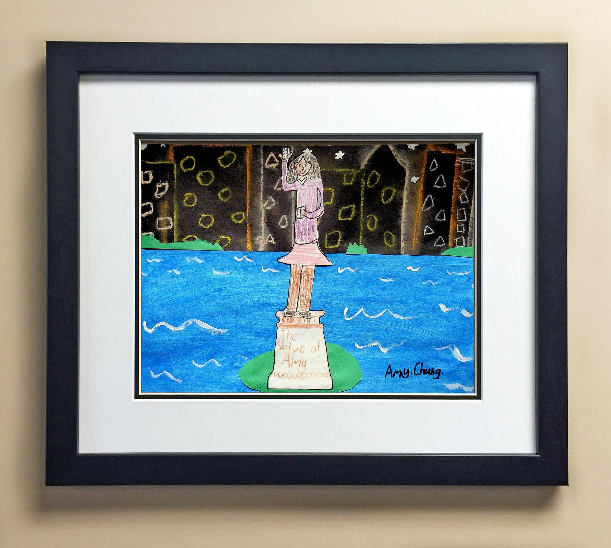 Included with the purchase is the Students Artwork, Frame, double matboard, shatter proof plexiglass, and a ready to hang backerboard with turnbuttons