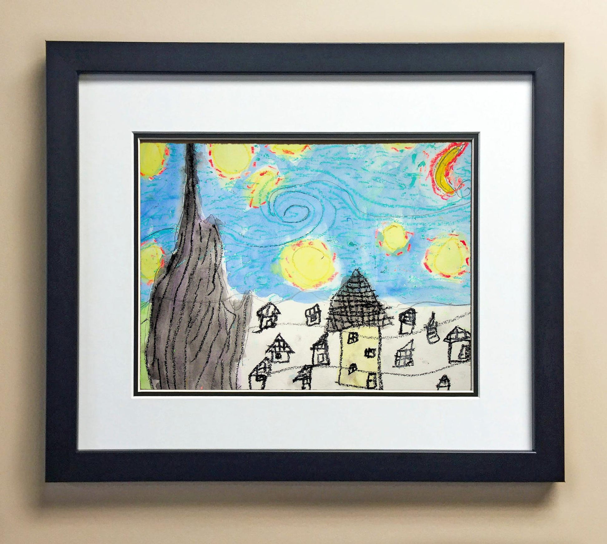 Included with the purchase is the Students Artwork, Frame, double matboard, shatter proof plexiglass, and a ready to hang backerboard with turnbuttons