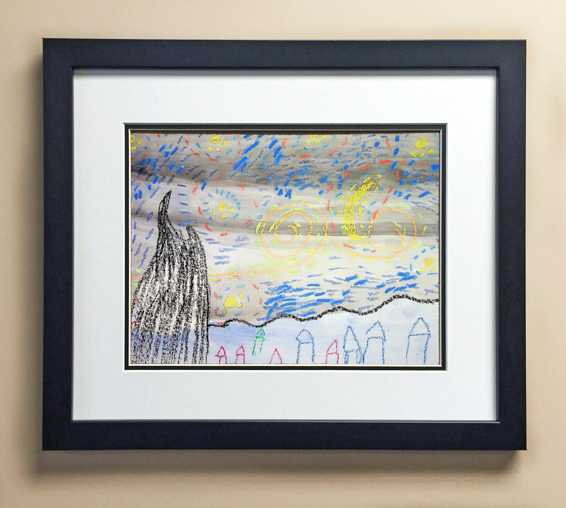 Included with the purchase is the Students Artwork, Frame, double matboard, shatter proof plexiglass, and a ready to hang backerboard with turnbuttons