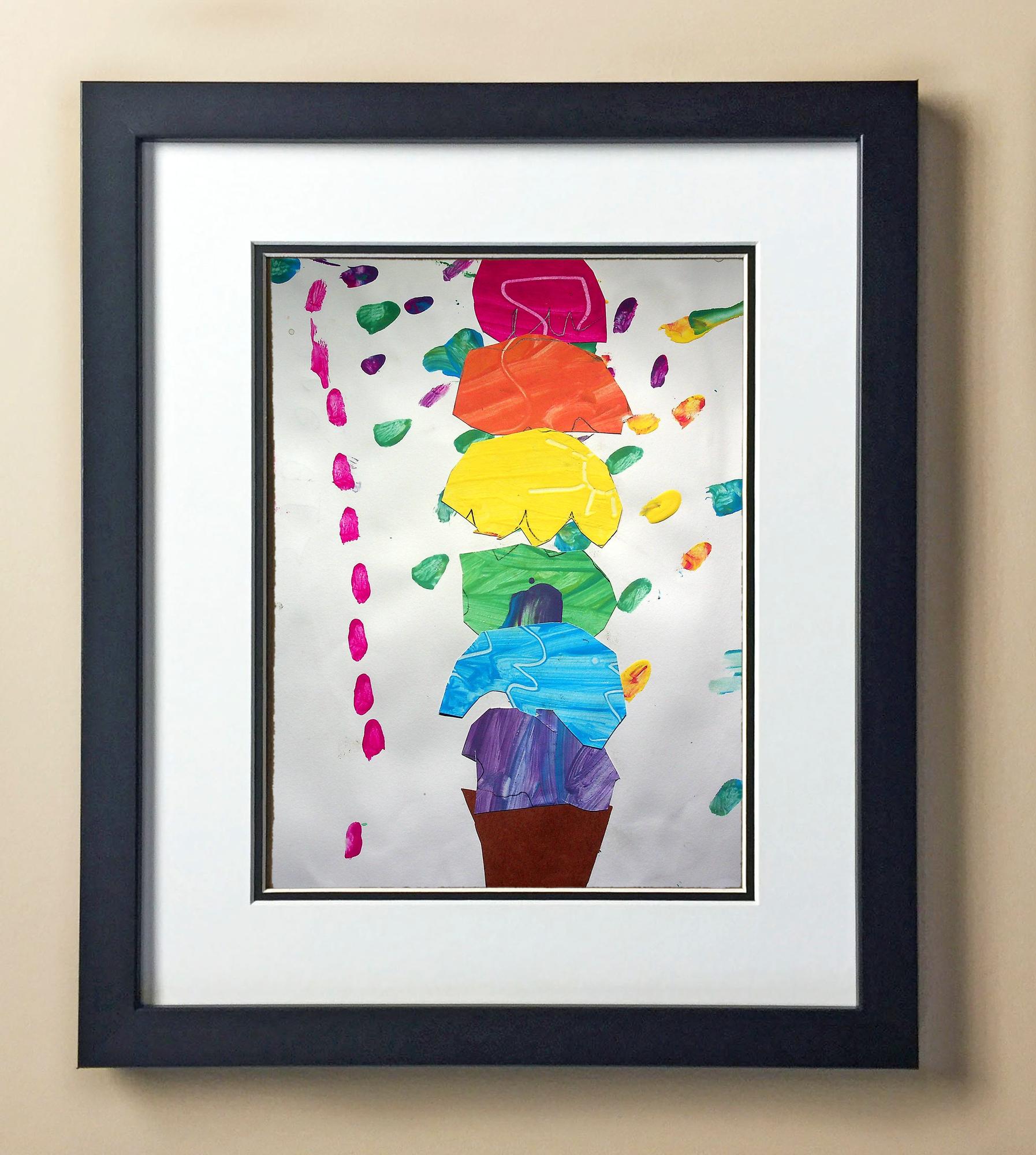 Included with the purchase is the Students Artwork, Frame, double matboard, shatter proof plexiglass, and a ready to hang backerboard with turnbuttons