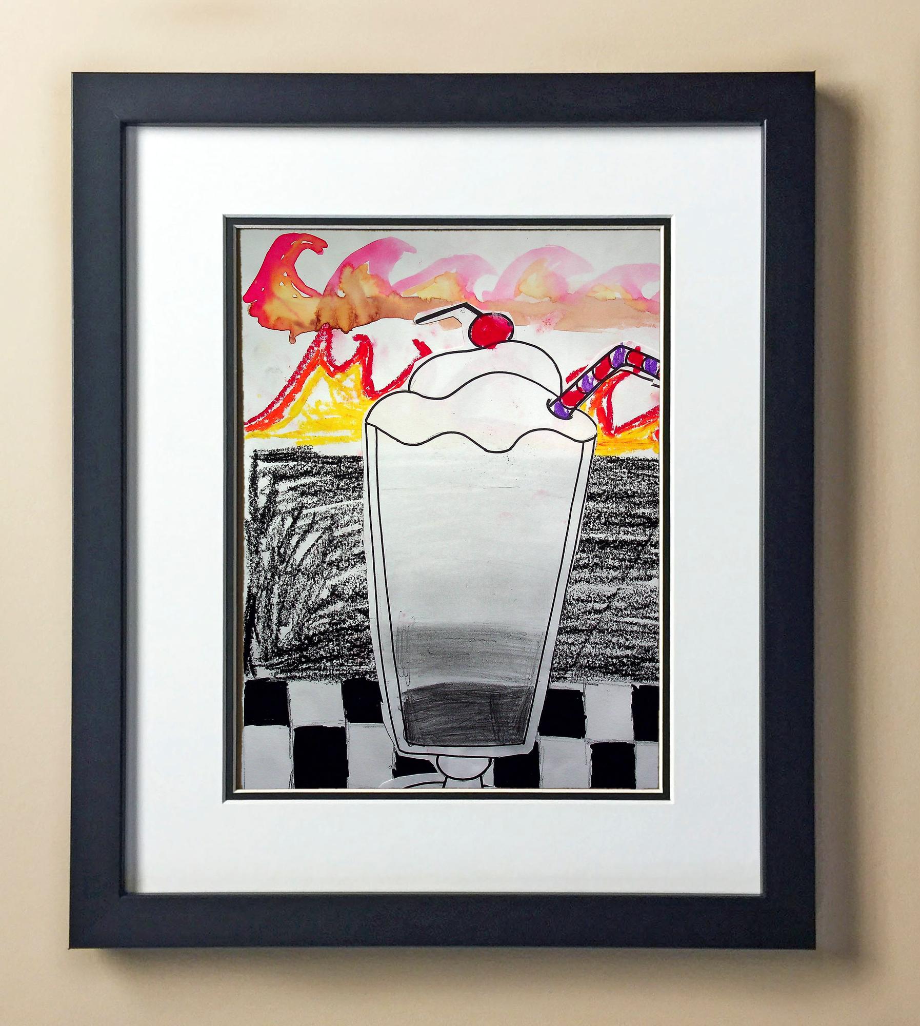 Included with the purchase is the Students Artwork, Frame, double matboard, shatter proof plexiglass, and a ready to hang backerboard with turnbuttons