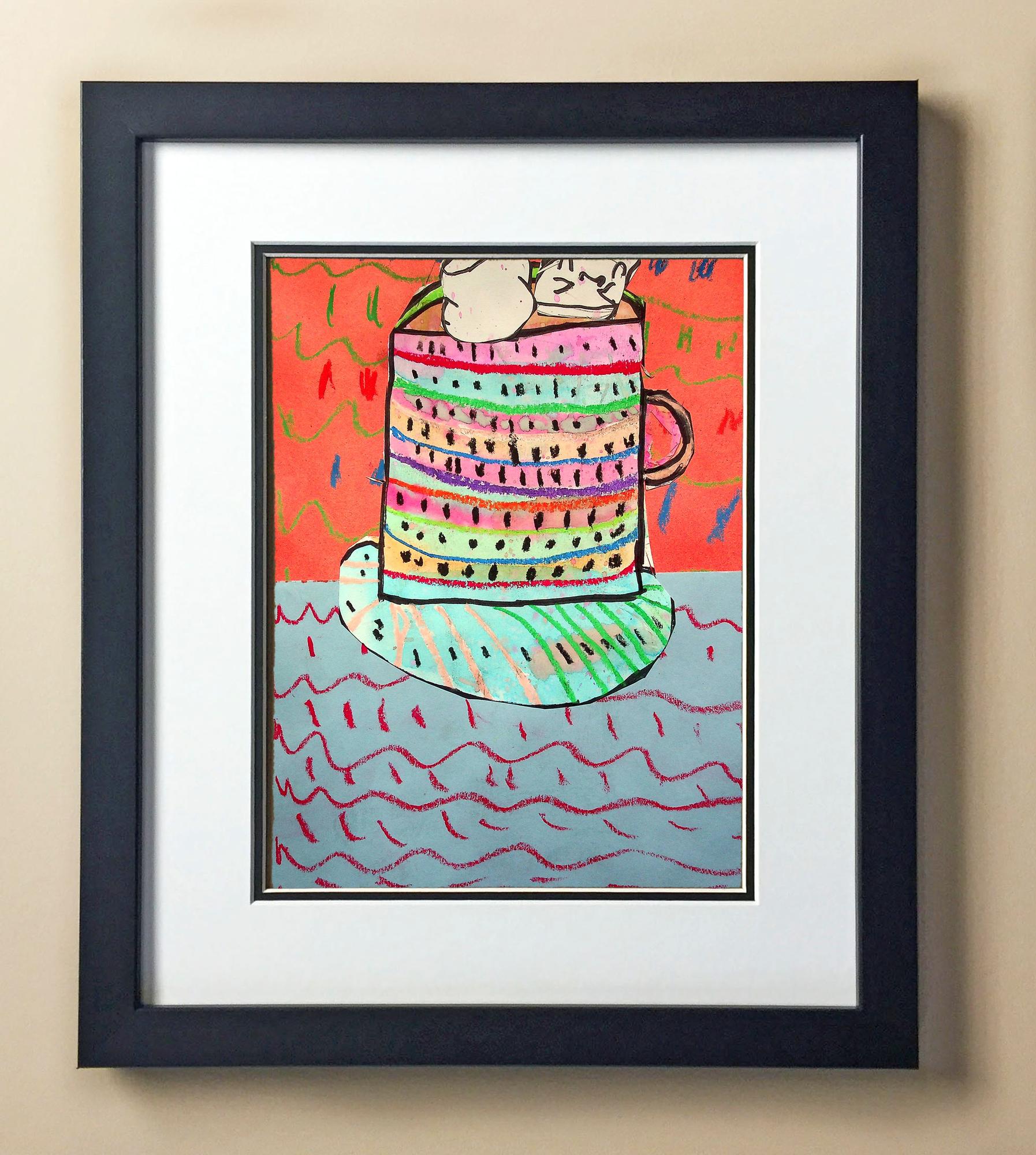 Included with the purchase is the Students Artwork, Frame, double matboard, shatter proof plexiglass, and a ready to hang backerboard with turnbuttons