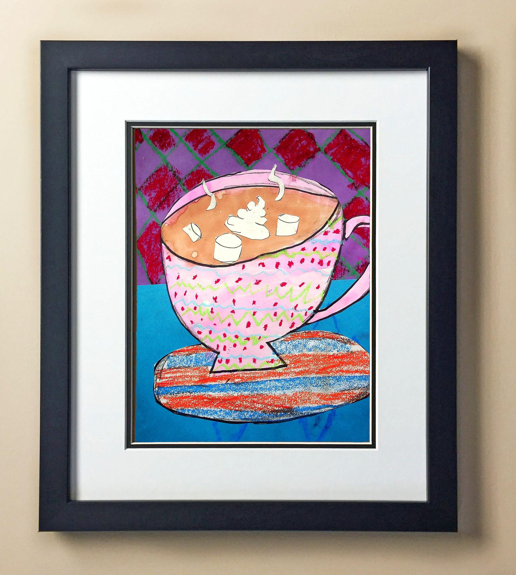 Included with the purchase is the Students Artwork, Frame, double matboard, shatter proof plexiglass, and a ready to hang backerboard with turnbuttons