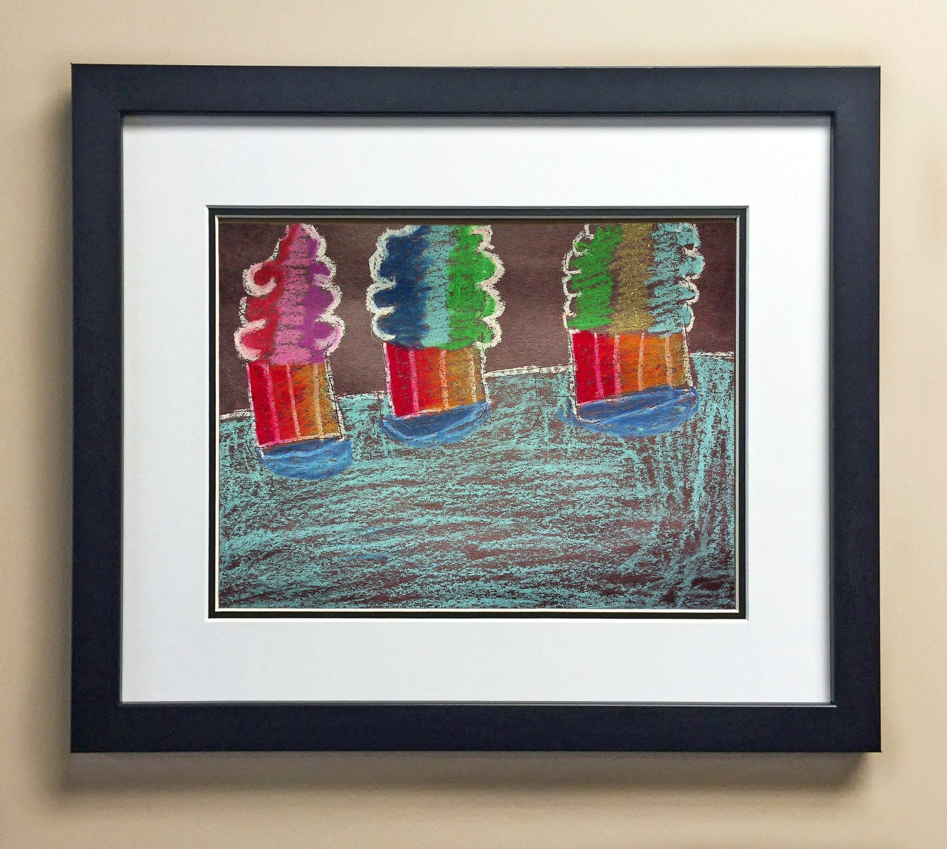 Included with the purchase is the Students Artwork, Frame, double matboard, shatter proof plexiglass, and a ready to hang backerboard with turnbuttons