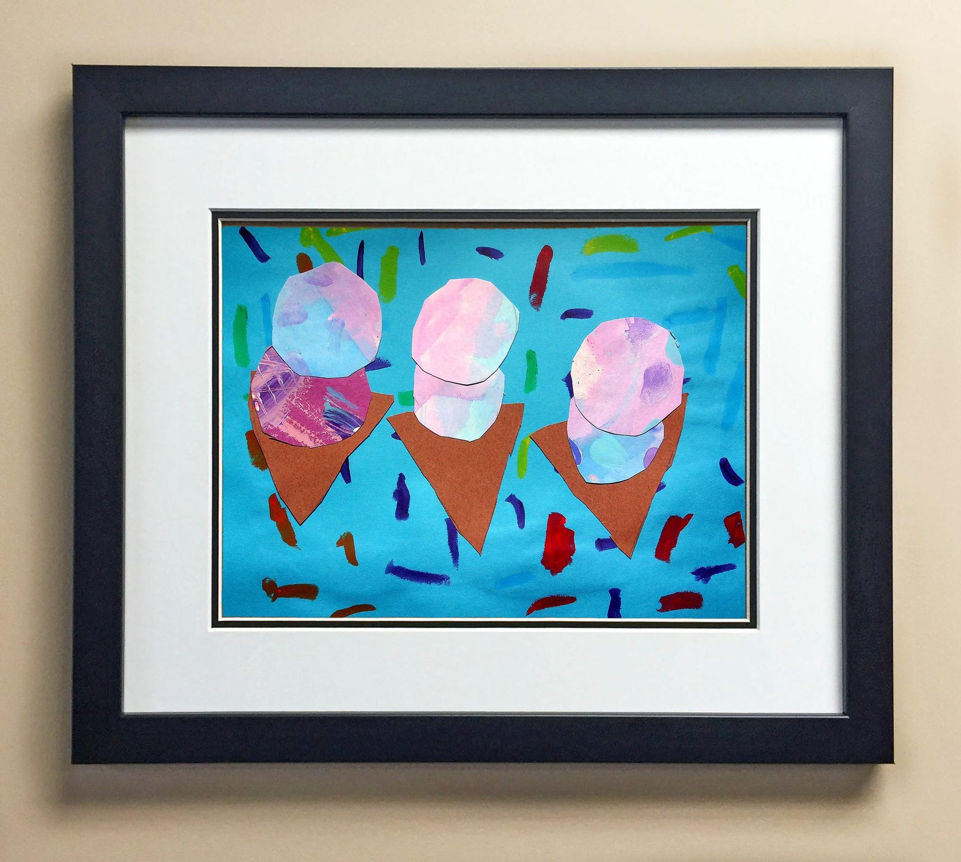 Included with the purchase is the Students Artwork, Frame, double matboard, shatter proof plexiglass, and a ready to hang backerboard with turnbuttons
