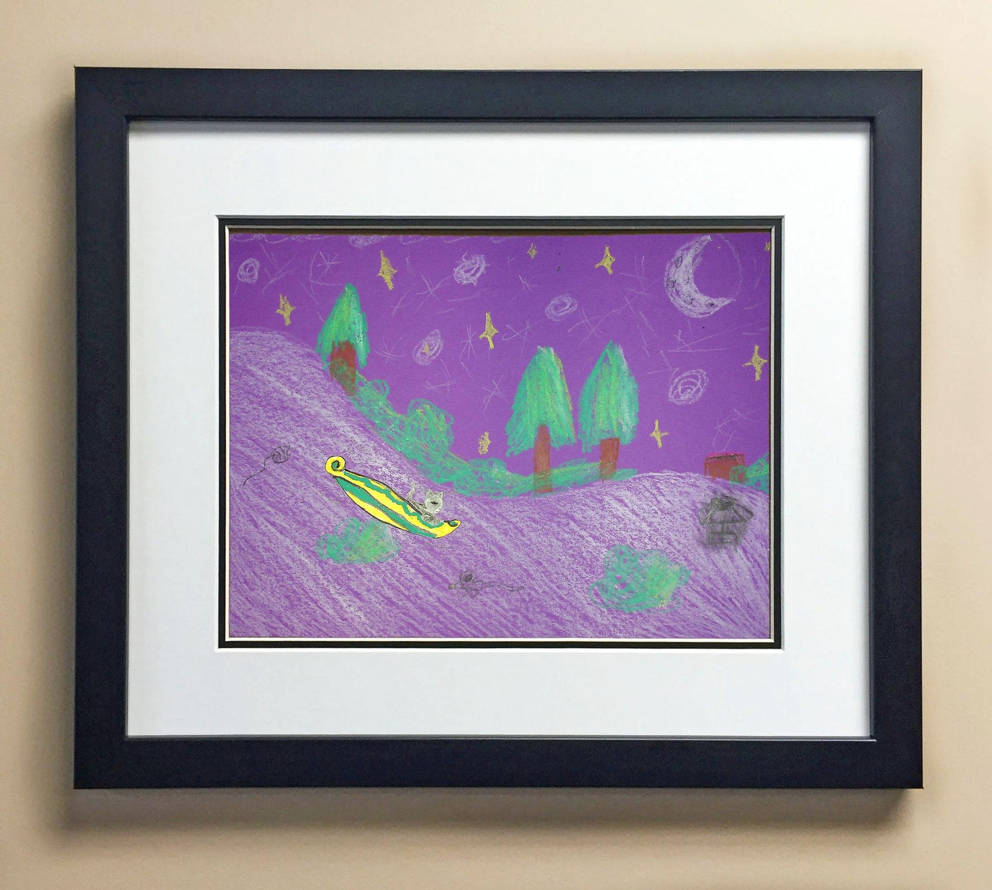 Included with the purchase is the Students Artwork, Frame, double matboard, shatter proof plexiglass, and a ready to hang backerboard with turnbuttons