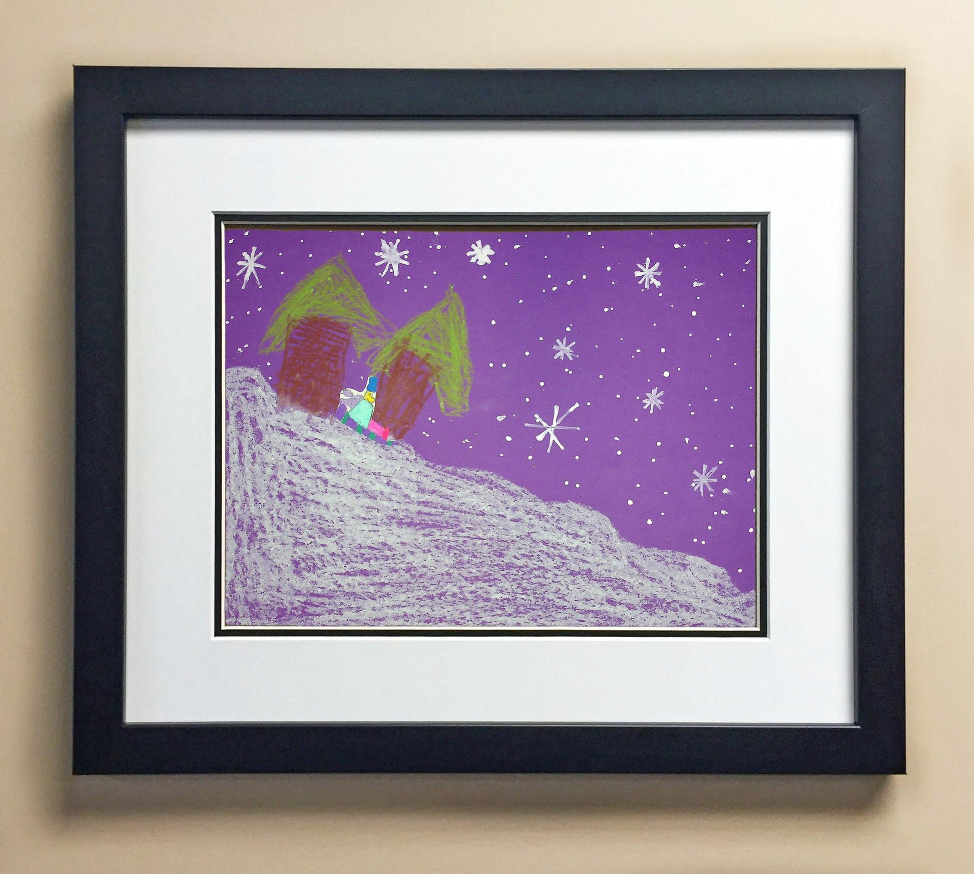 Included with the purchase is the Students Artwork, Frame, double matboard, shatter proof plexiglass, and a ready to hang backerboard with turnbuttons