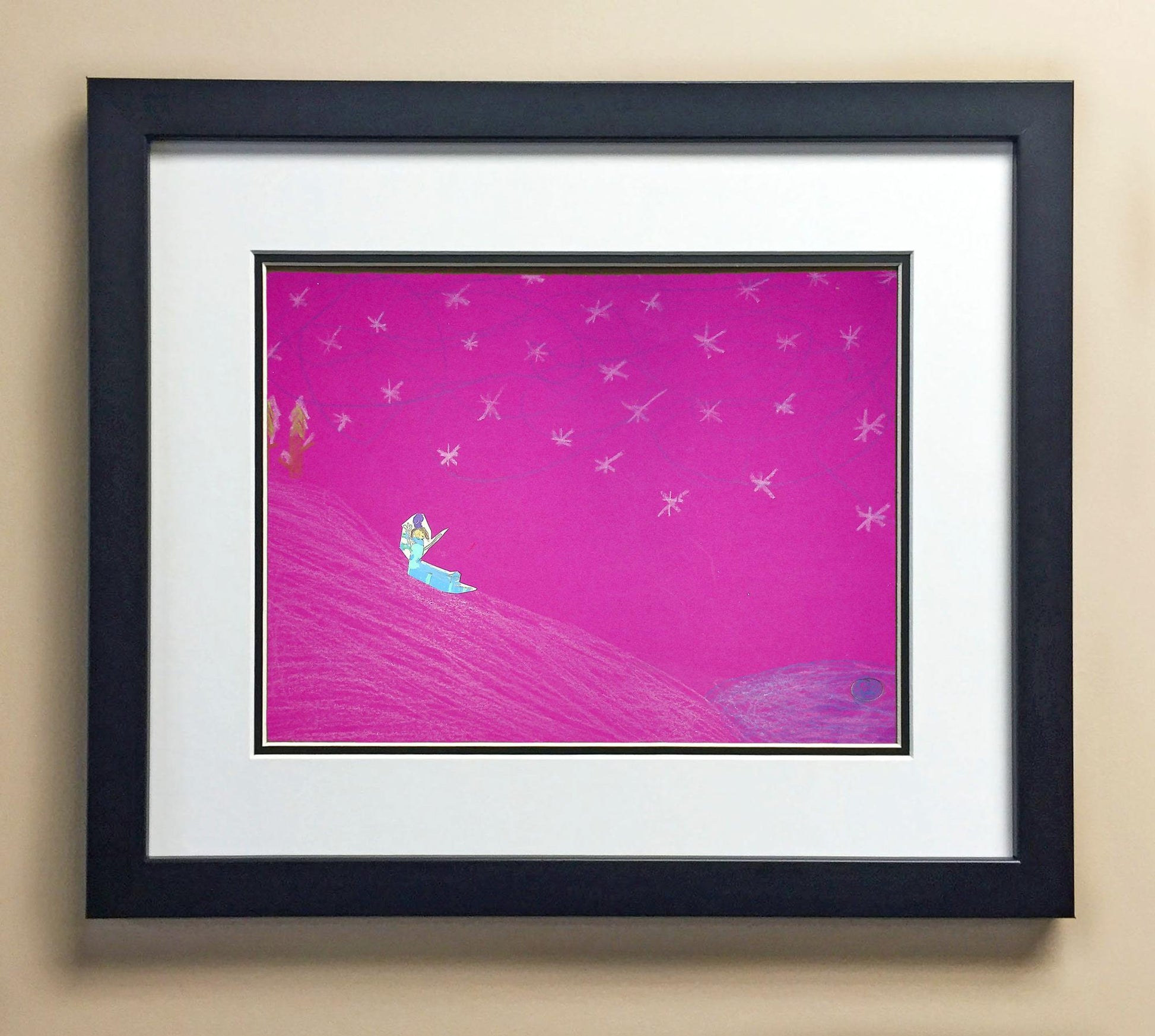 Included with the purchase is the Students Artwork, Frame, double matboard, shatter proof plexiglass, and a ready to hang backerboard with turnbuttons
