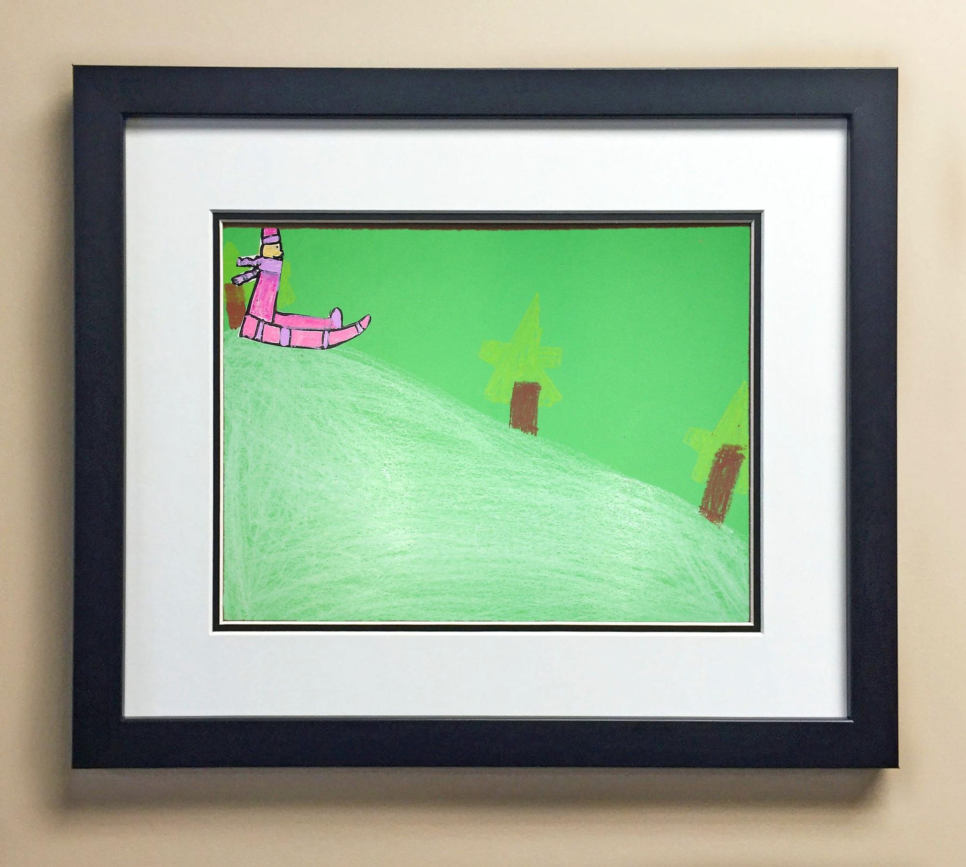 Included with the purchase is the Students Artwork, Frame, double matboard, shatter proof plexiglass, and a ready to hang backerboard with turnbuttons