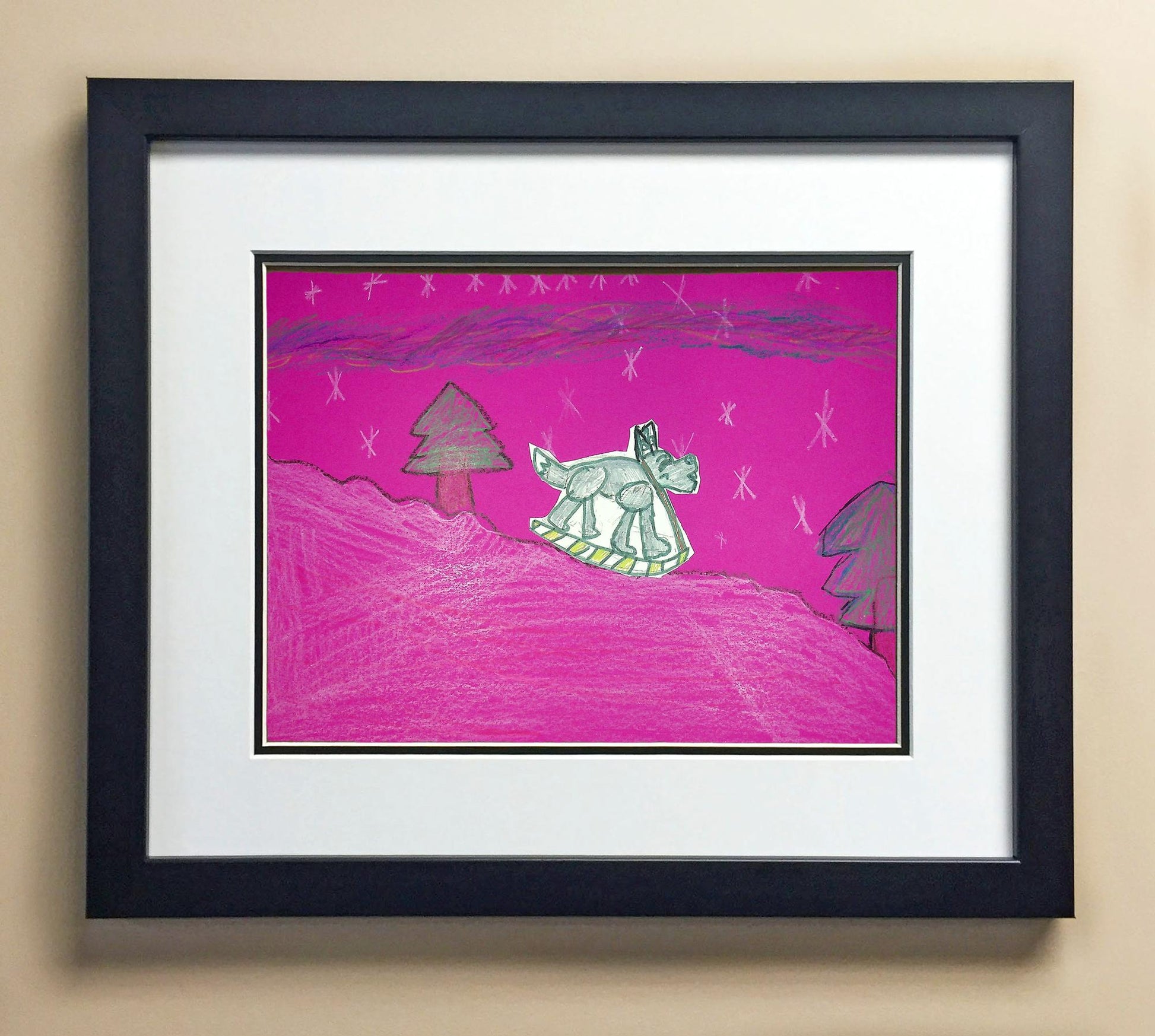 Included with the purchase is the Students Artwork, Frame, double matboard, shatter proof plexiglass, and a ready to hang backerboard with turnbuttons