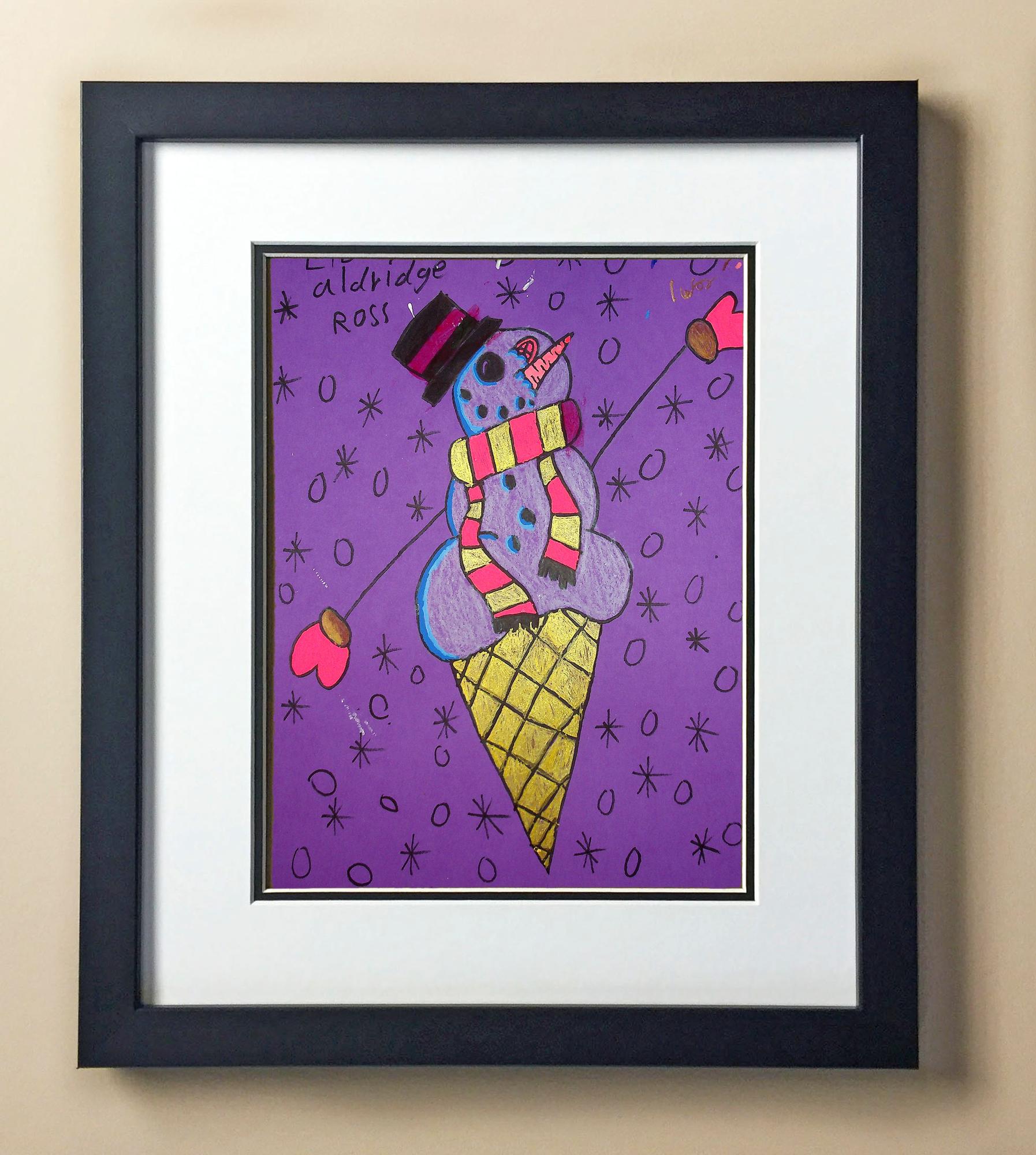 Included with the purchase is the Students Artwork, Frame, double matboard, shatter proof plexiglass, and a ready to hang backerboard with turnbuttons