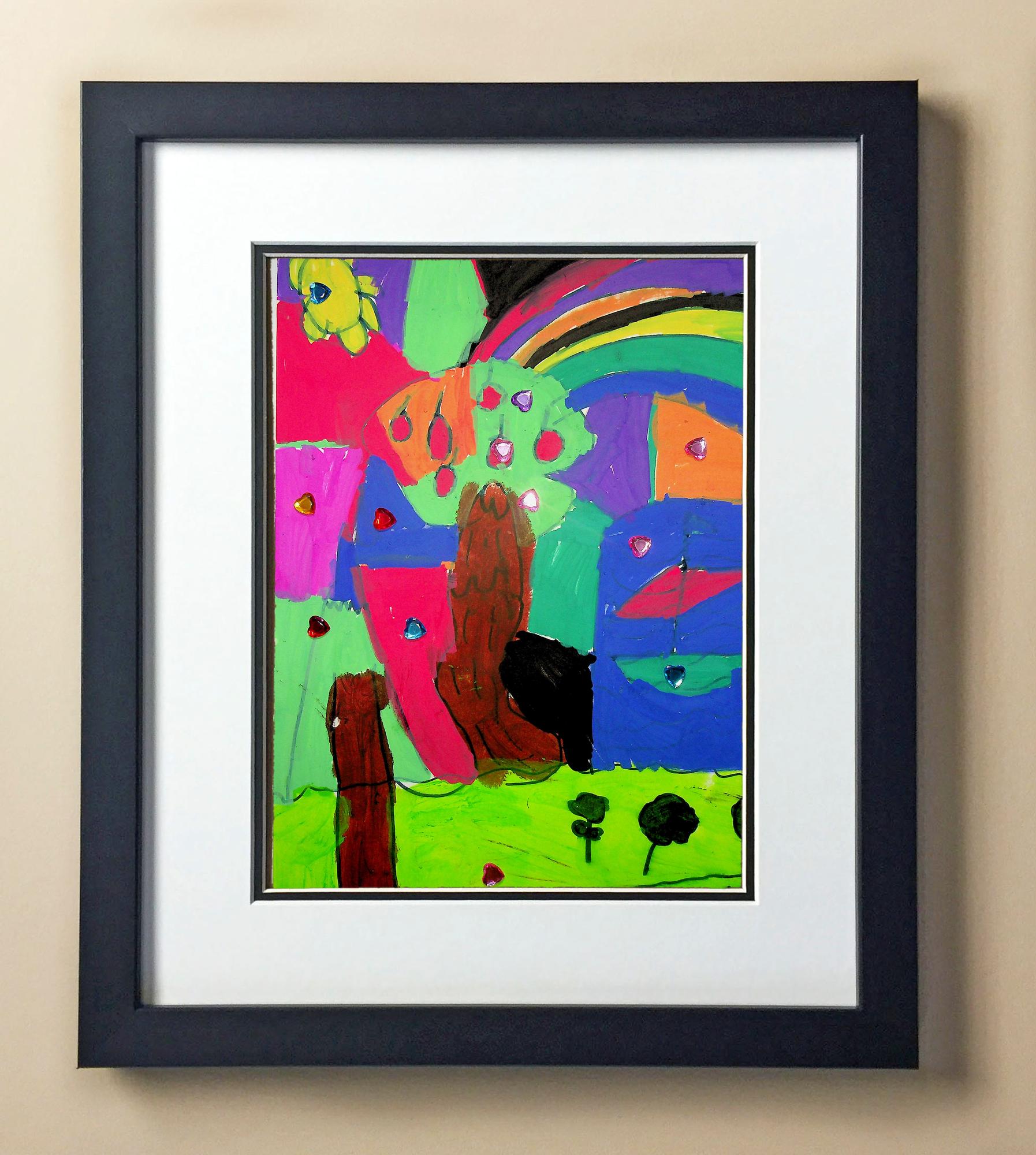 Included with the purchase is the Students Artwork, Frame, double matboard, shatter proof plexiglass, and a ready to hang backerboard with turnbuttons