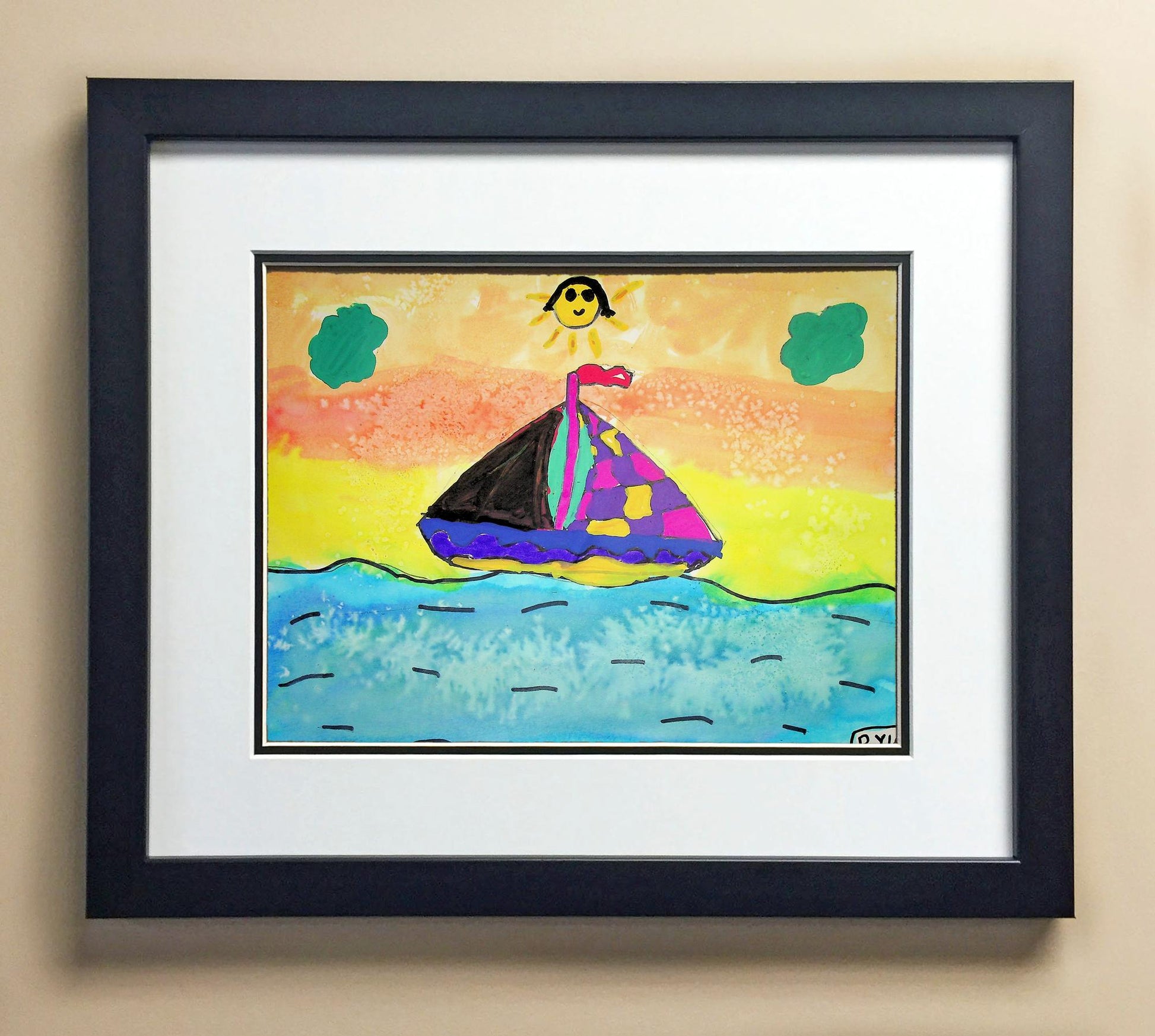 Included with the purchase is the Students Artwork, Frame, double matboard, shatter proof plexiglass, and a ready to hang backerboard with turnbuttons