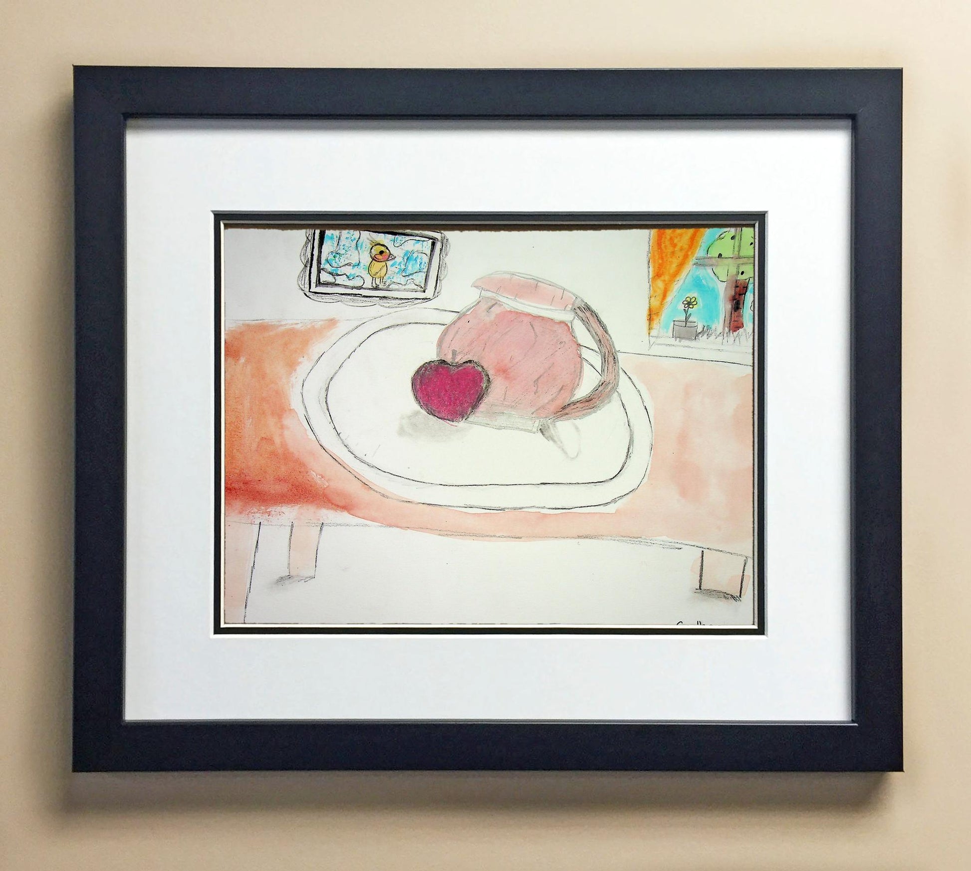 Included with the purchase is the Students Artwork, Frame, double matboard, shatter proof plexiglass, and a ready to hang backerboard with turnbuttons