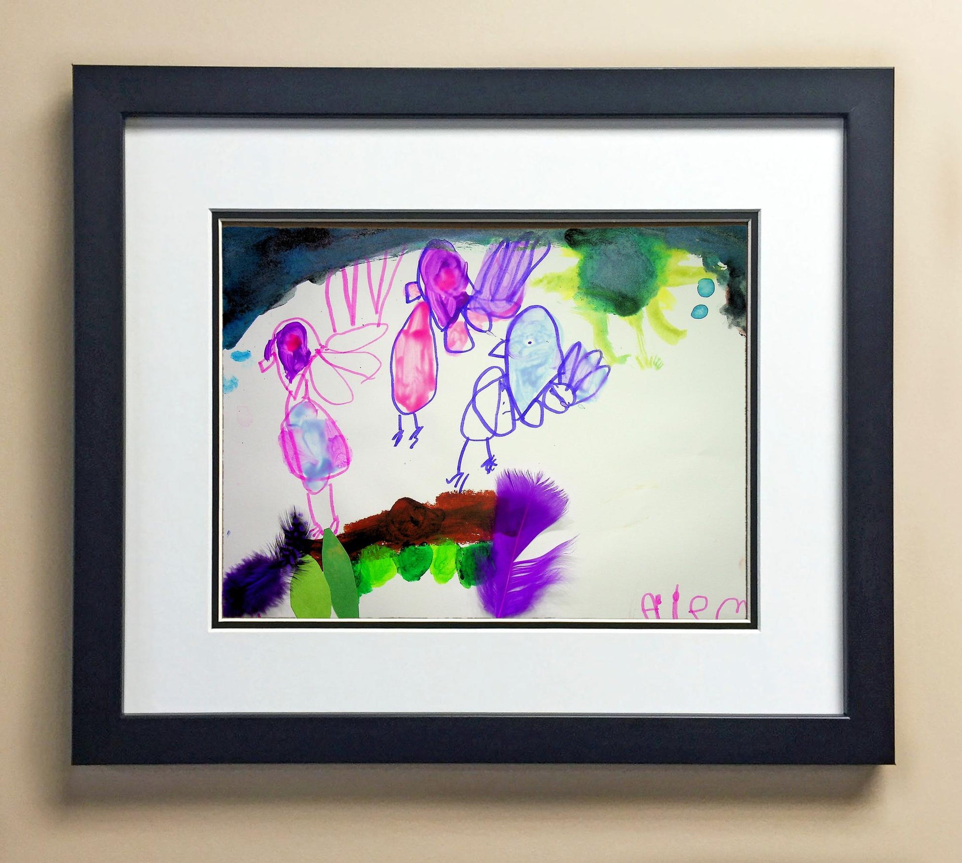 Included with the purchase is the Students Artwork, Frame, double matboard, shatter proof plexiglass, and a ready to hang backerboard with turnbuttons