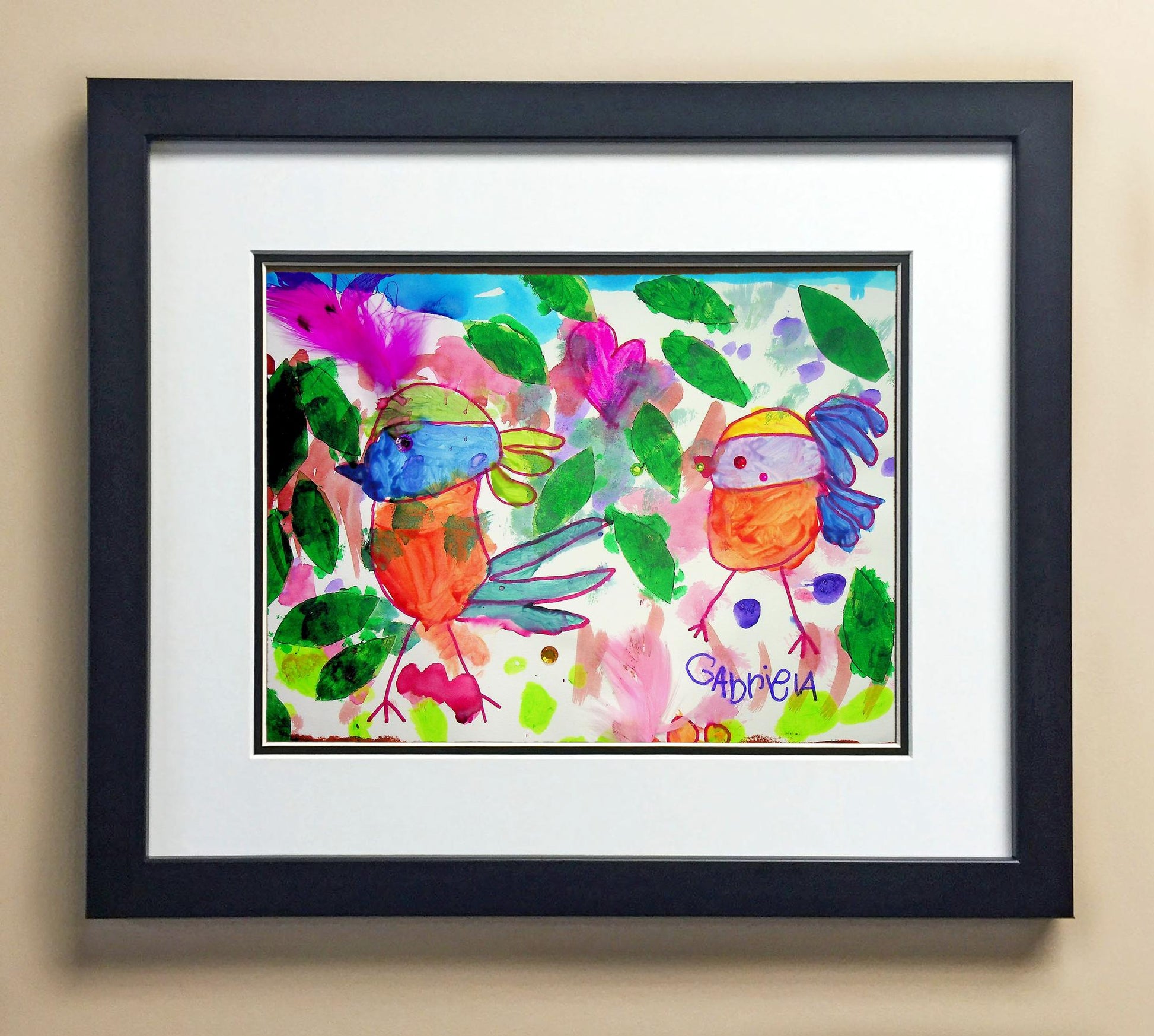 Included with the purchase is the Students Artwork, Frame, double matboard, shatter proof plexiglass, and a ready to hang backerboard with turnbuttons