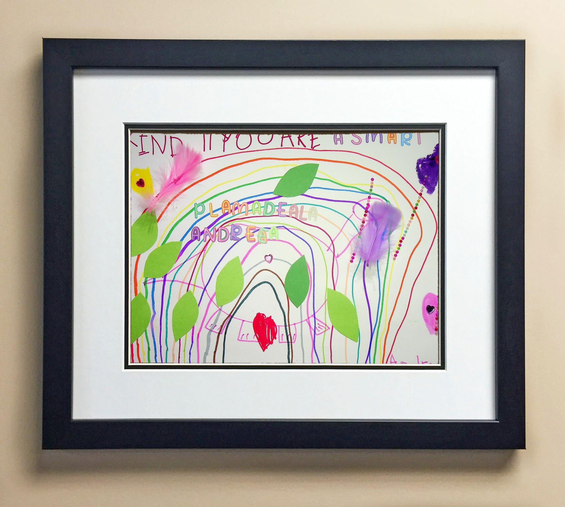 Included with the purchase is the Students Artwork, Frame, double matboard, shatter proof plexiglass, and a ready to hang backerboard with turnbuttons