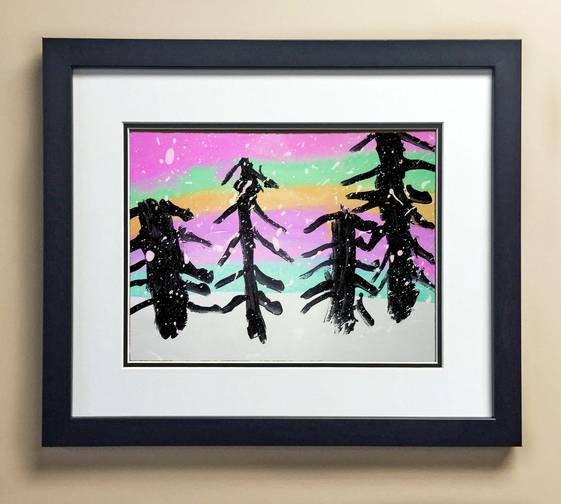 Included with the purchase is the Students Artwork, Frame, double matboard, shatter proof plexiglass, and a ready to hang backerboard with turnbuttons