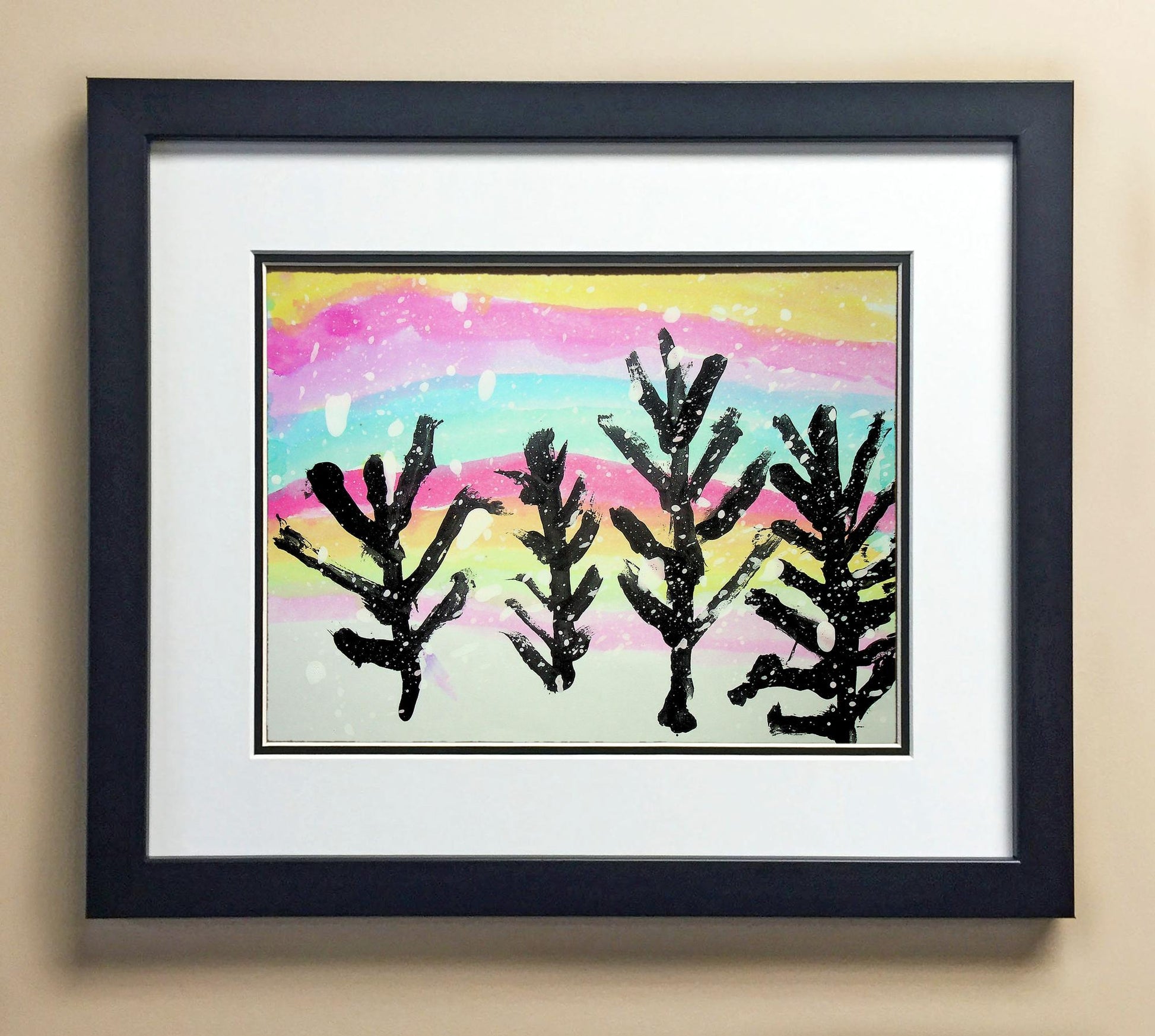 Included with the purchase is the Students Artwork, Frame, double matboard, shatter proof plexiglass, and a ready to hang backerboard with turnbuttons