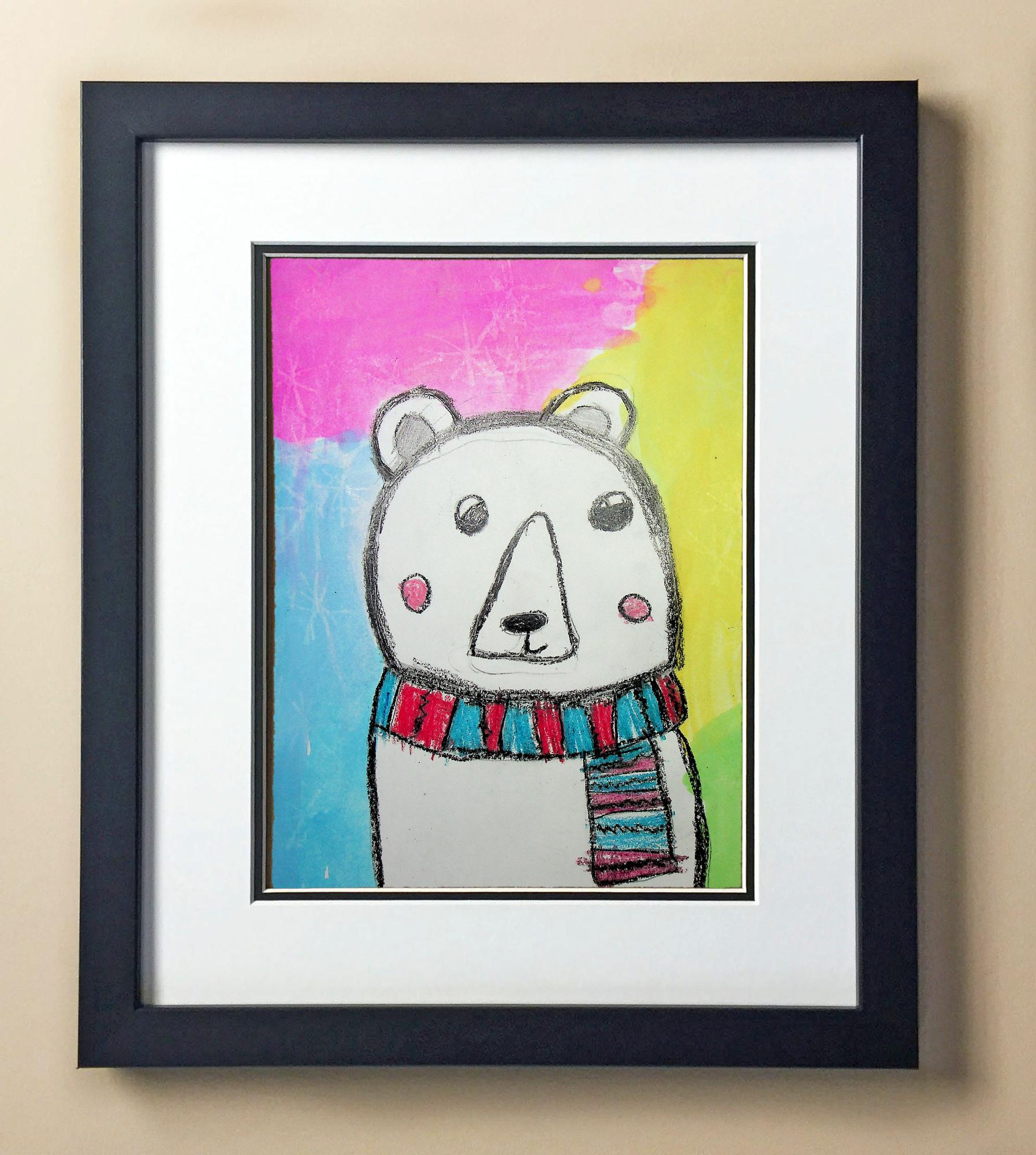 Included with the purchase is the Students Artwork, Frame, double matboard, shatter proof plexiglass, and a ready to hang backerboard with turnbuttons