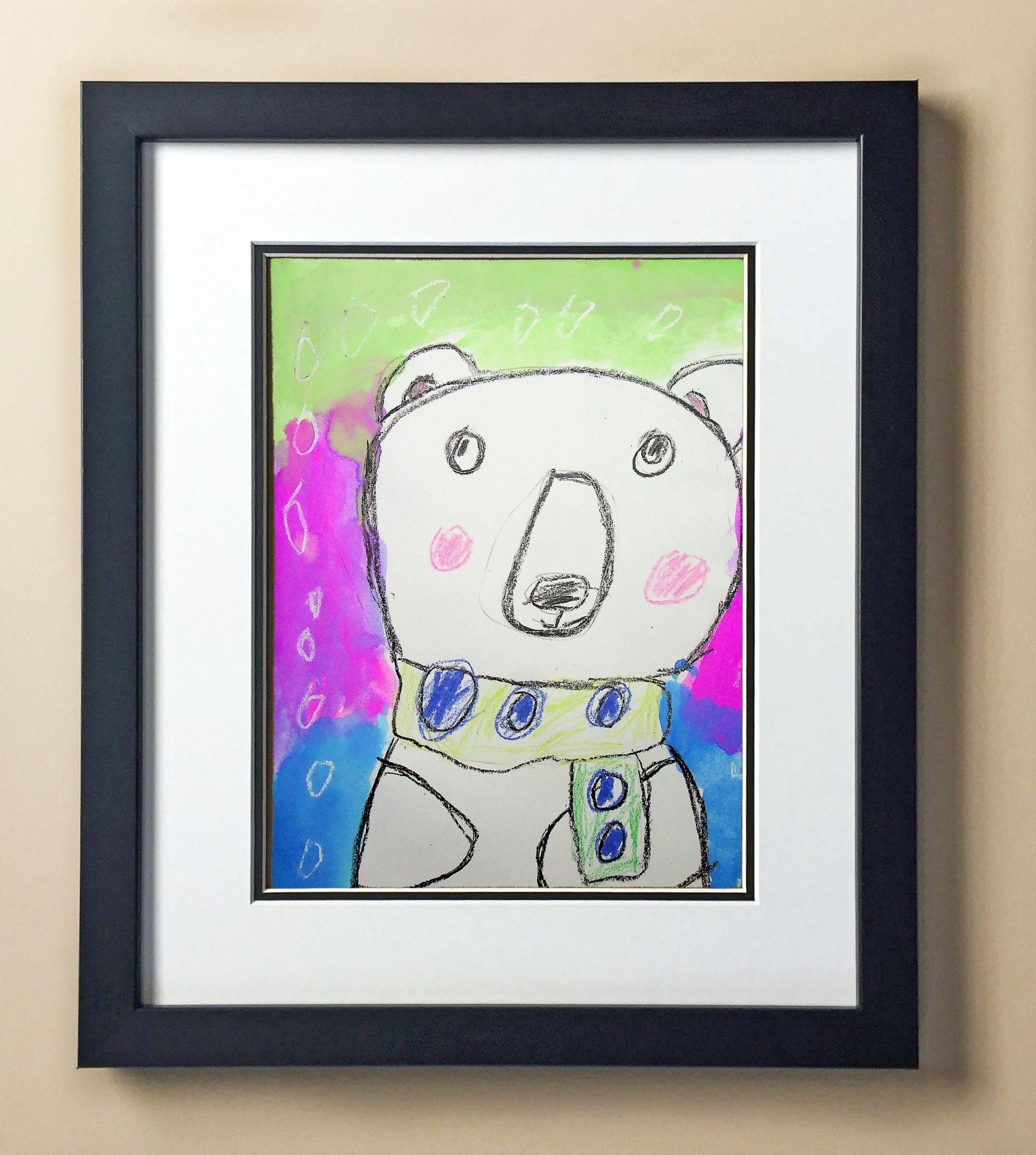 Included with the purchase is the Students Artwork, Frame, double matboard, shatter proof plexiglass, and a ready to hang backerboard with turnbuttons