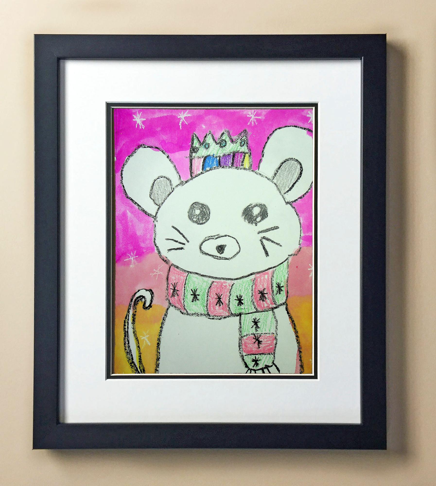 Included with the purchase is the Students Artwork, Frame, double matboard, shatter proof plexiglass, and a ready to hang backerboard with turnbuttons