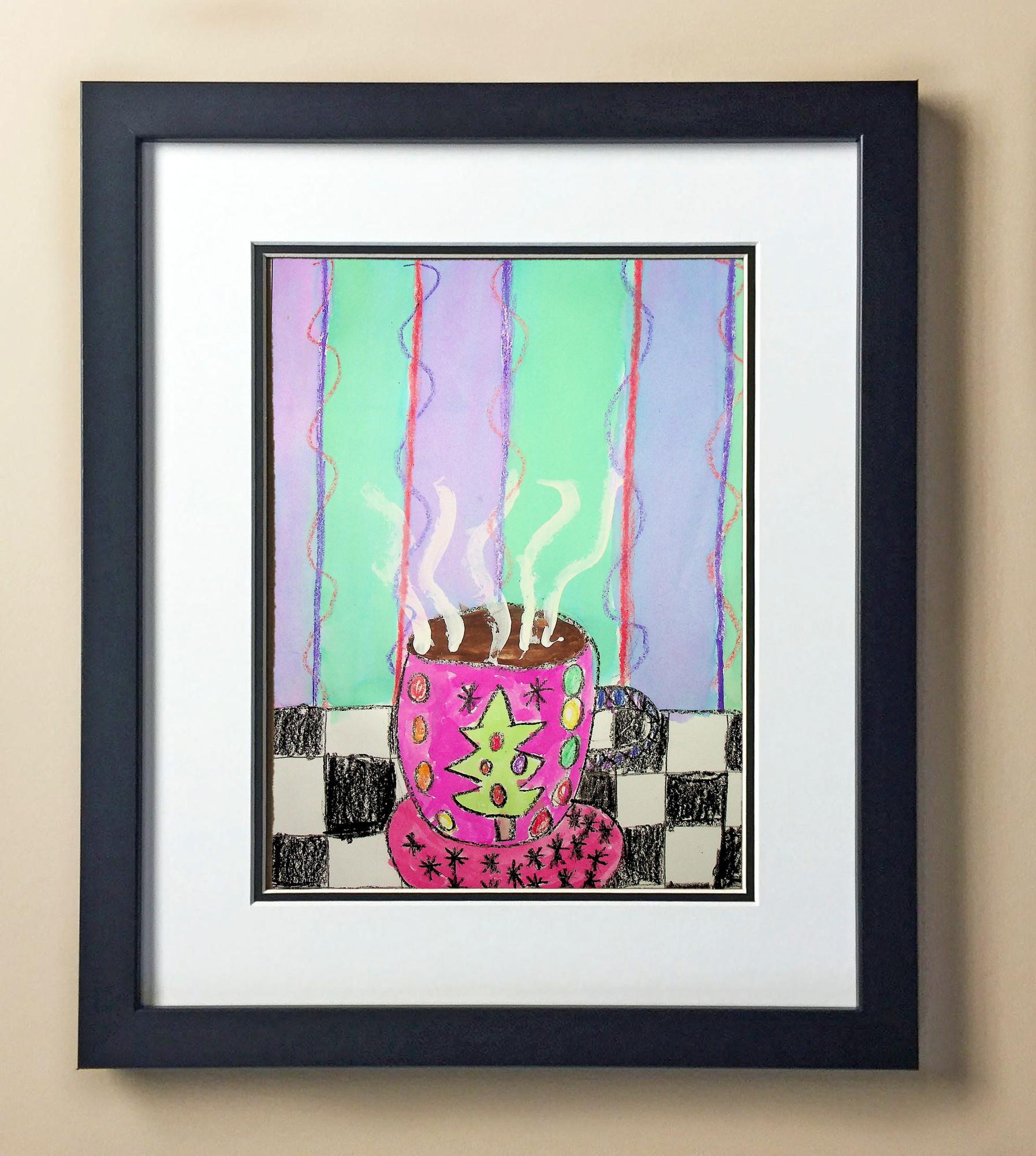 Included with the purchase is the Students Artwork, Frame, double matboard, shatter proof plexiglass, and a ready to hang backerboard with turnbuttons
