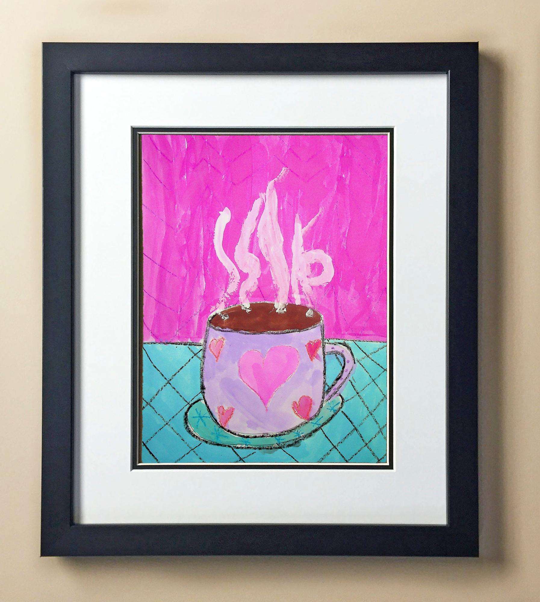 Included with the purchase is the Students Artwork, Frame, double matboard, shatter proof plexiglass, and a ready to hang backerboard with turnbuttons