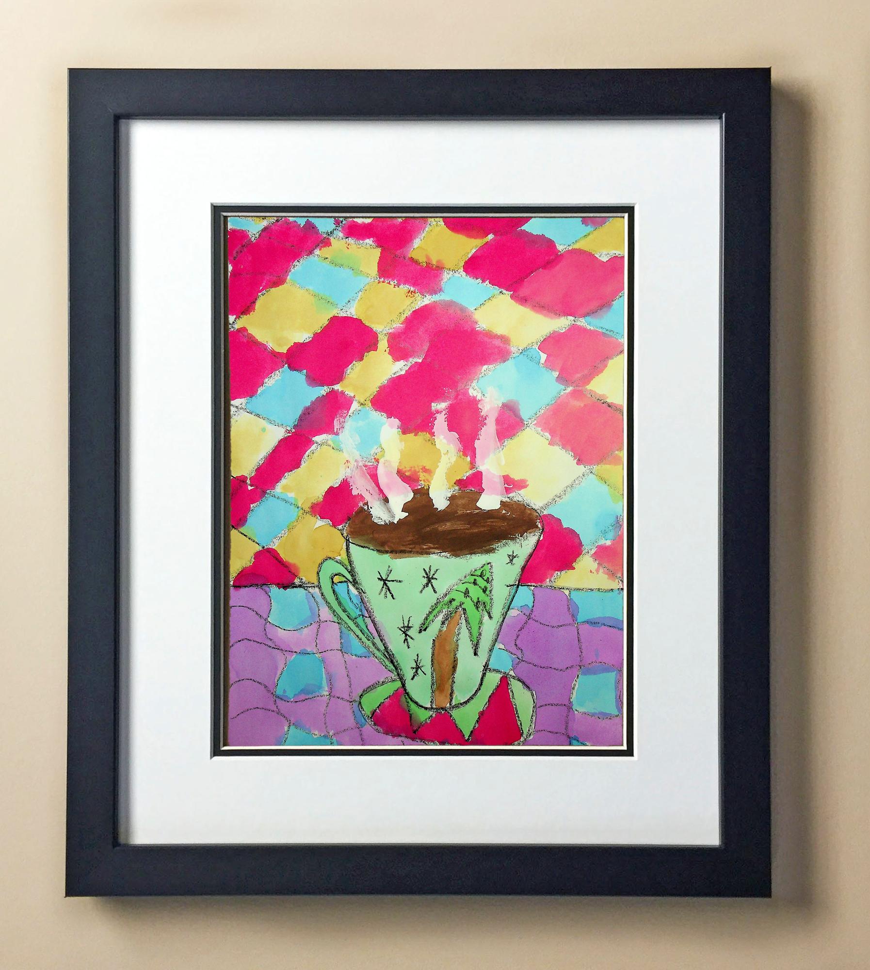Included with the purchase is the Students Artwork, Frame, double matboard, shatter proof plexiglass, and a ready to hang backerboard with turnbuttons