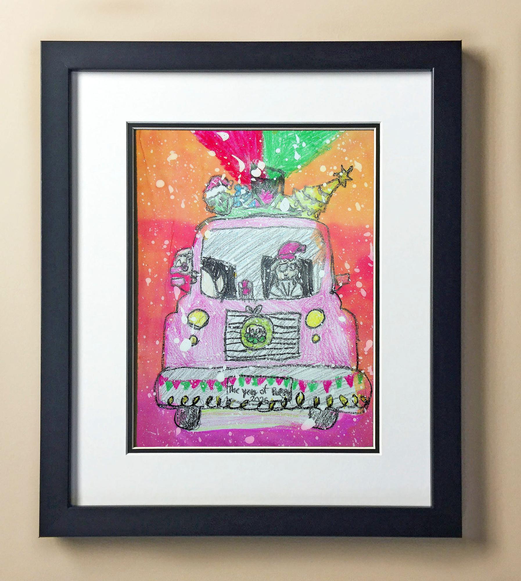 Included with the purchase is the Students Artwork, Frame, double matboard, shatter proof plexiglass, and a ready to hang backerboard with turnbuttons