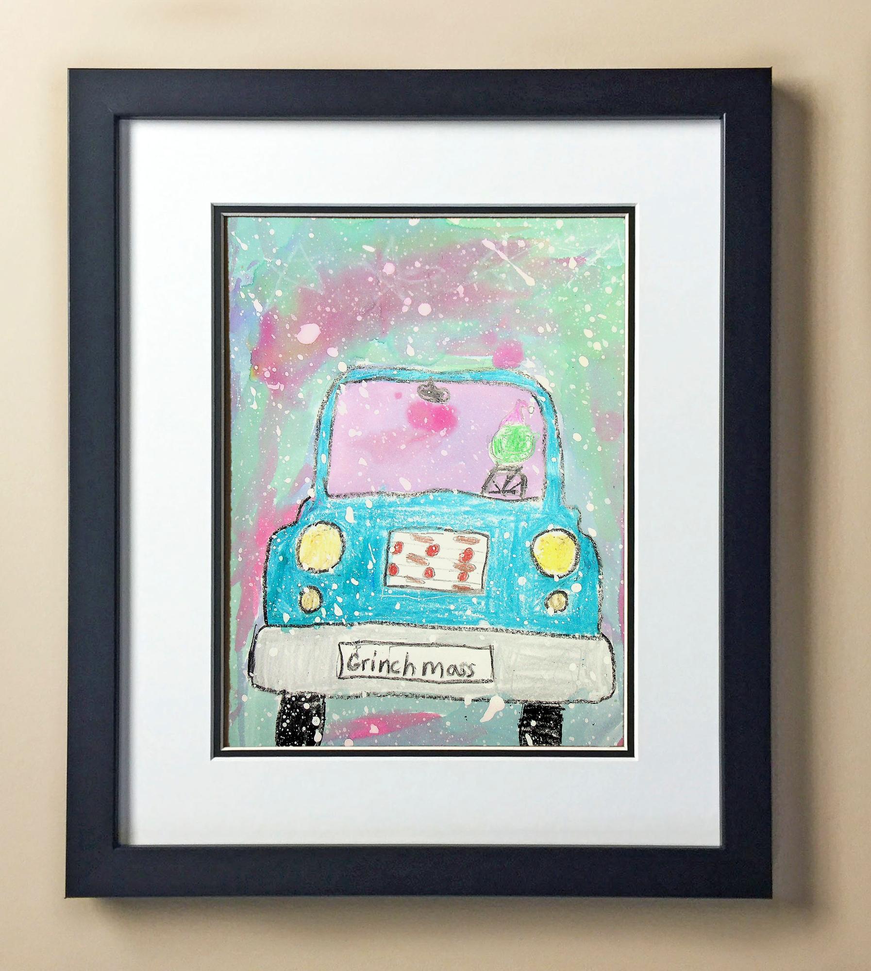 Included with the purchase is the Students Artwork, Frame, double matboard, shatter proof plexiglass, and a ready to hang backerboard with turnbuttons