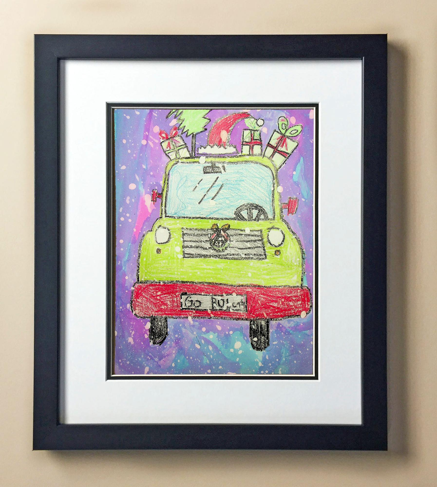 Included with the purchase is the Students Artwork, Frame, double matboard, shatter proof plexiglass, and a ready to hang backerboard with turnbuttons