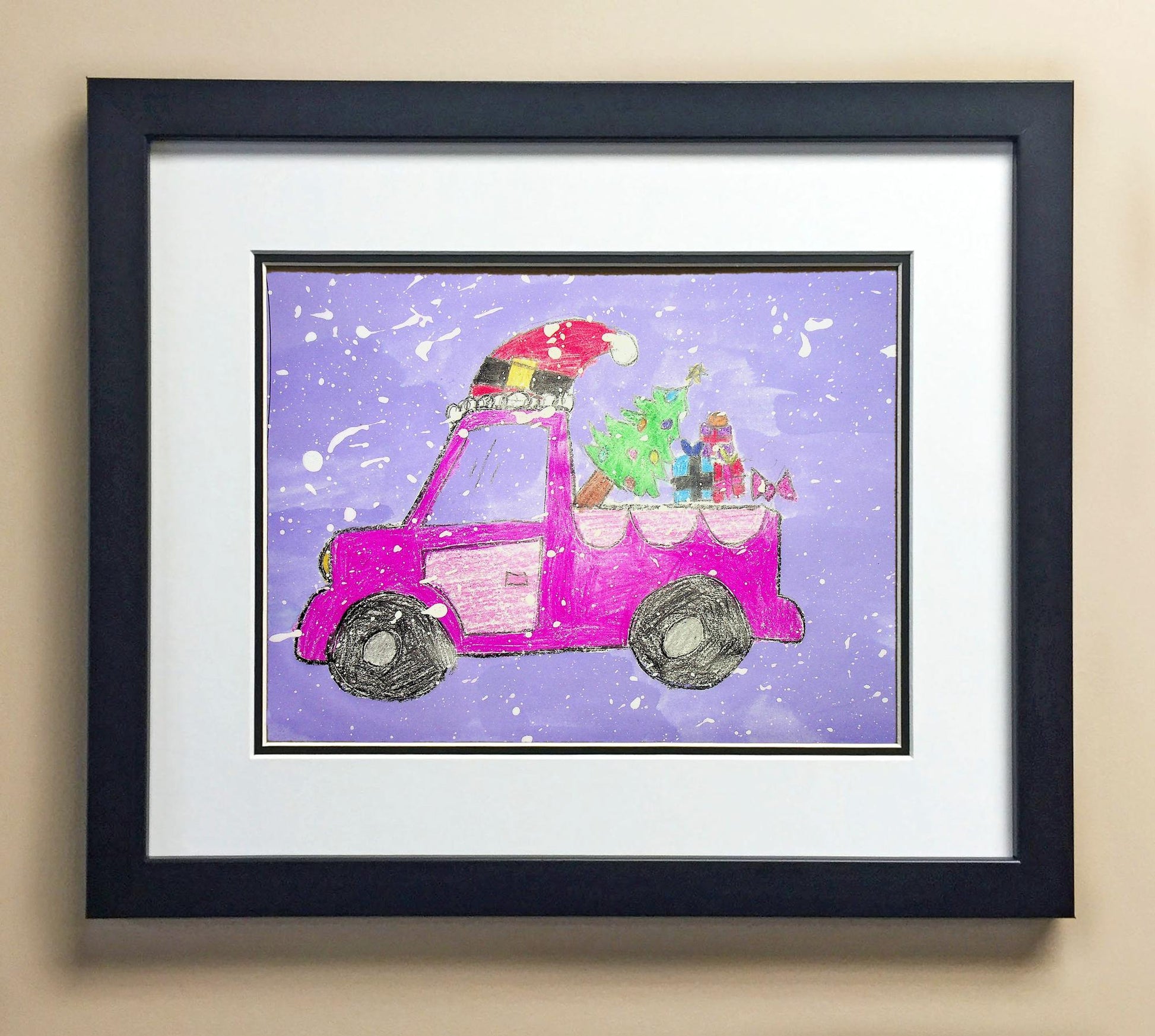 Included with the purchase is the Students Artwork, Frame, double matboard, shatter proof plexiglass, and a ready to hang backerboard with turnbuttons