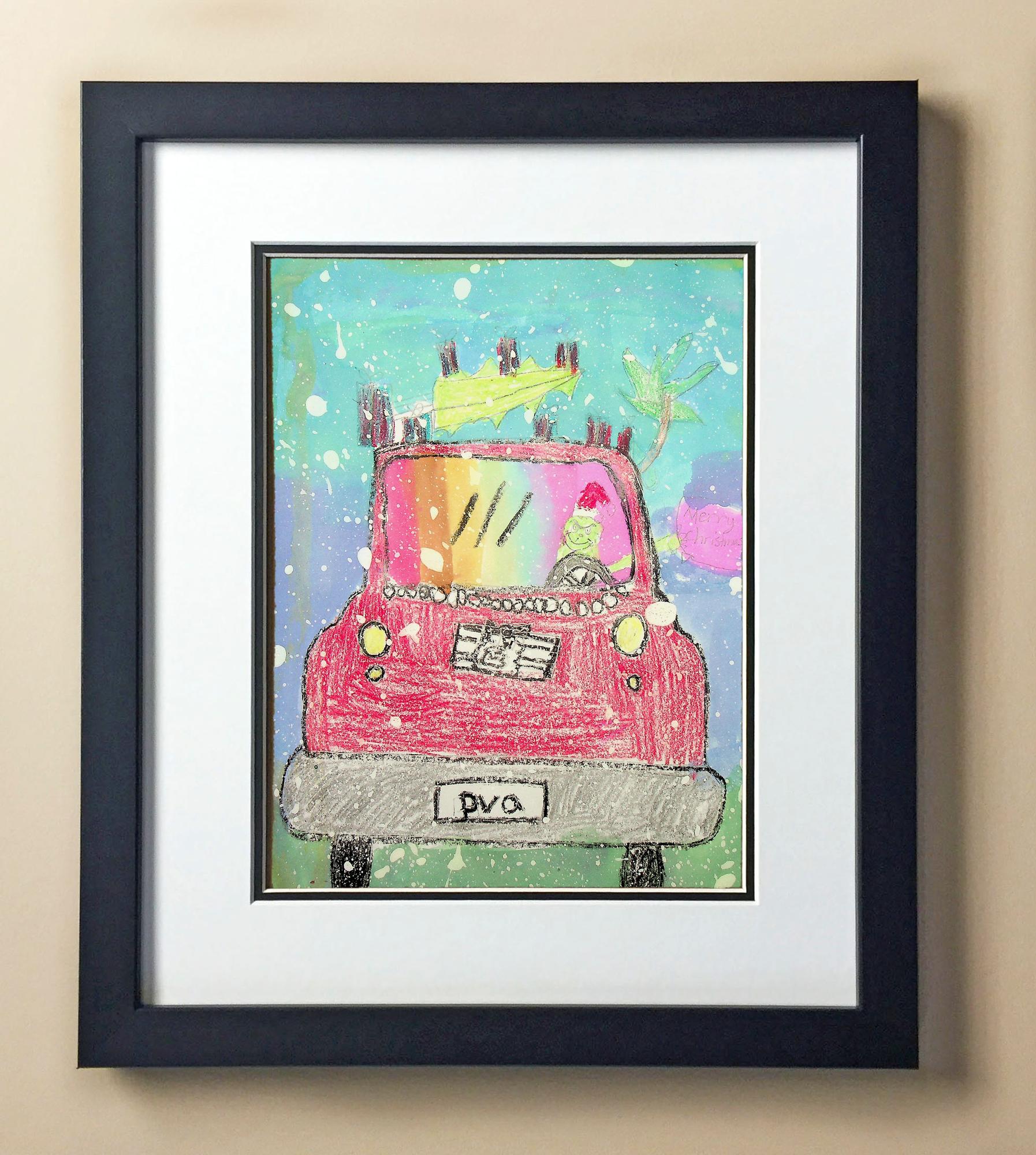 Included with the purchase is the Students Artwork, Frame, double matboard, shatter proof plexiglass, and a ready to hang backerboard with turnbuttons
