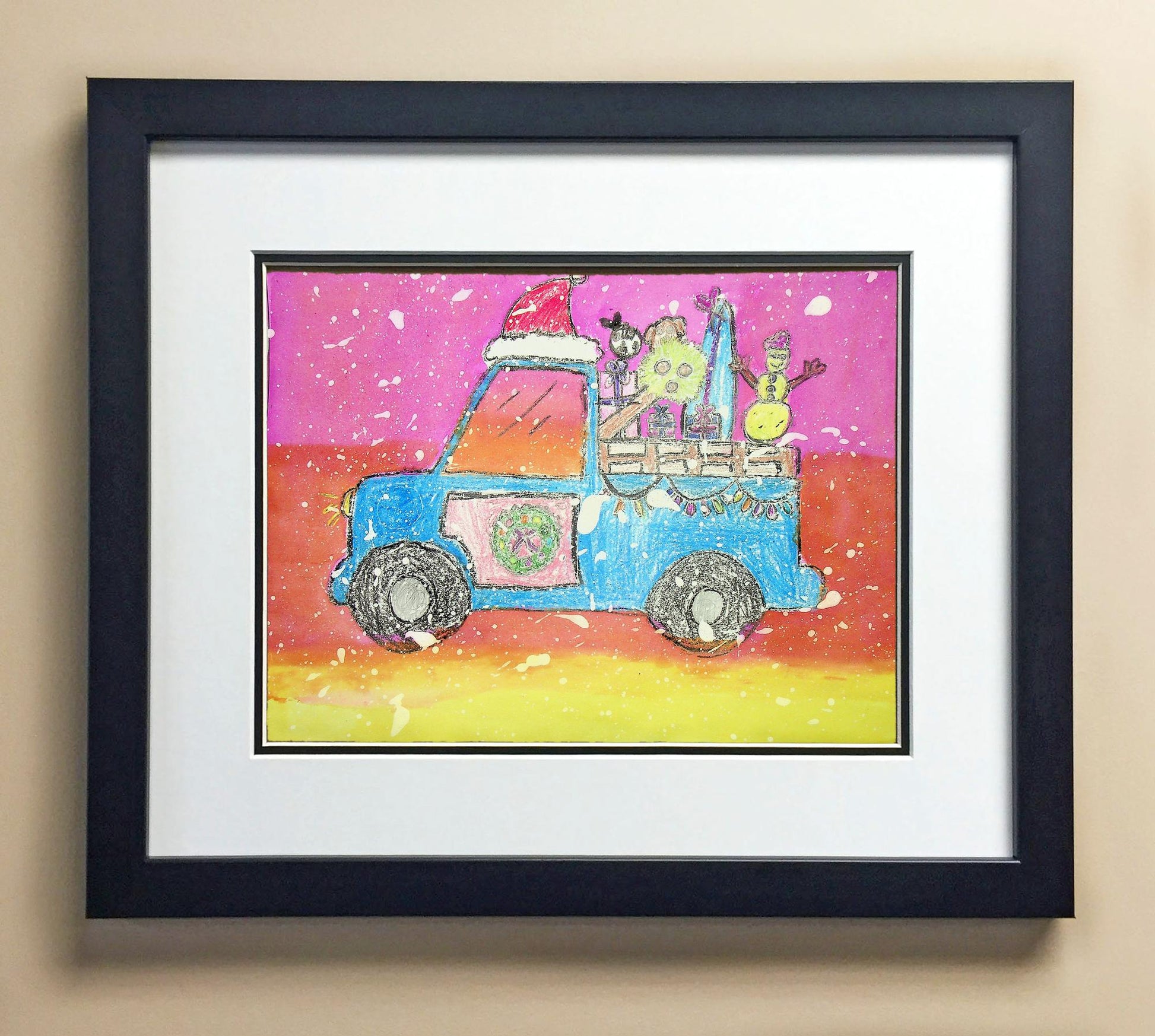 Included with the purchase is the Students Artwork, Frame, double matboard, shatter proof plexiglass, and a ready to hang backerboard with turnbuttons