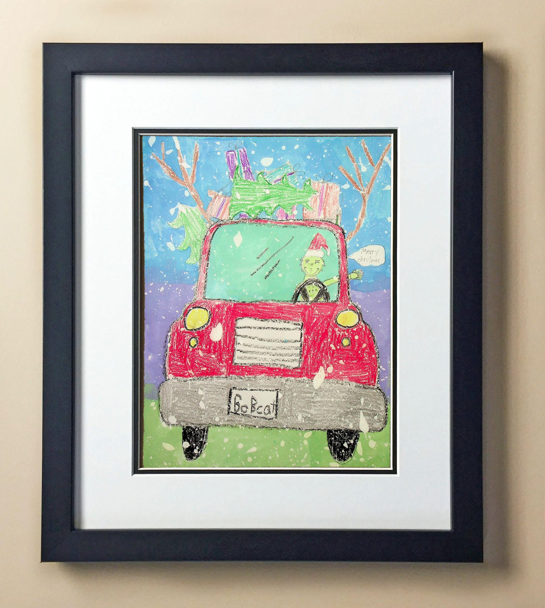 Included with the purchase is the Students Artwork, Frame, double matboard, shatter proof plexiglass, and a ready to hang backerboard with turnbuttons