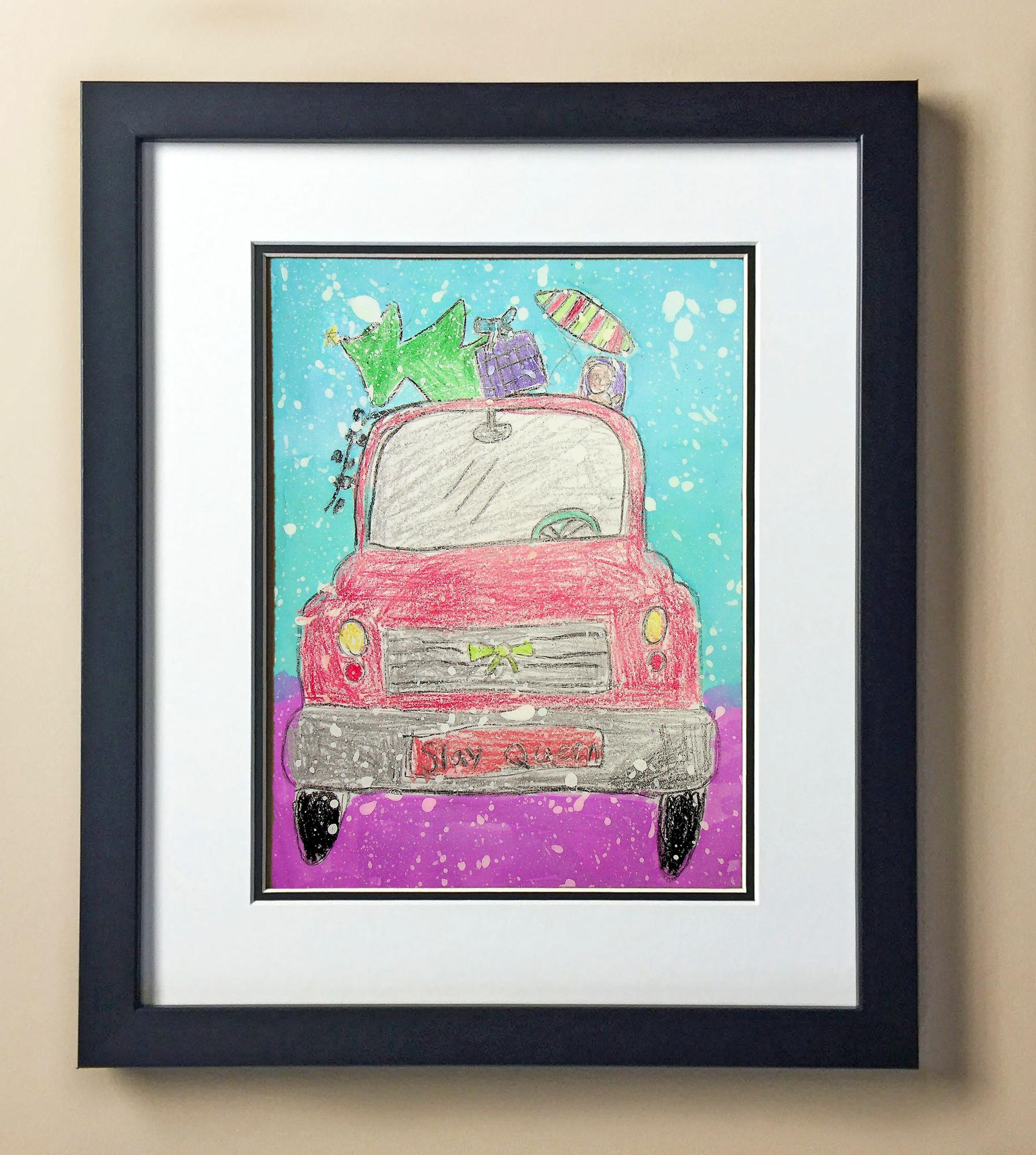 Included with the purchase is the Students Artwork, Frame, double matboard, shatter proof plexiglass, and a ready to hang backerboard with turnbuttons