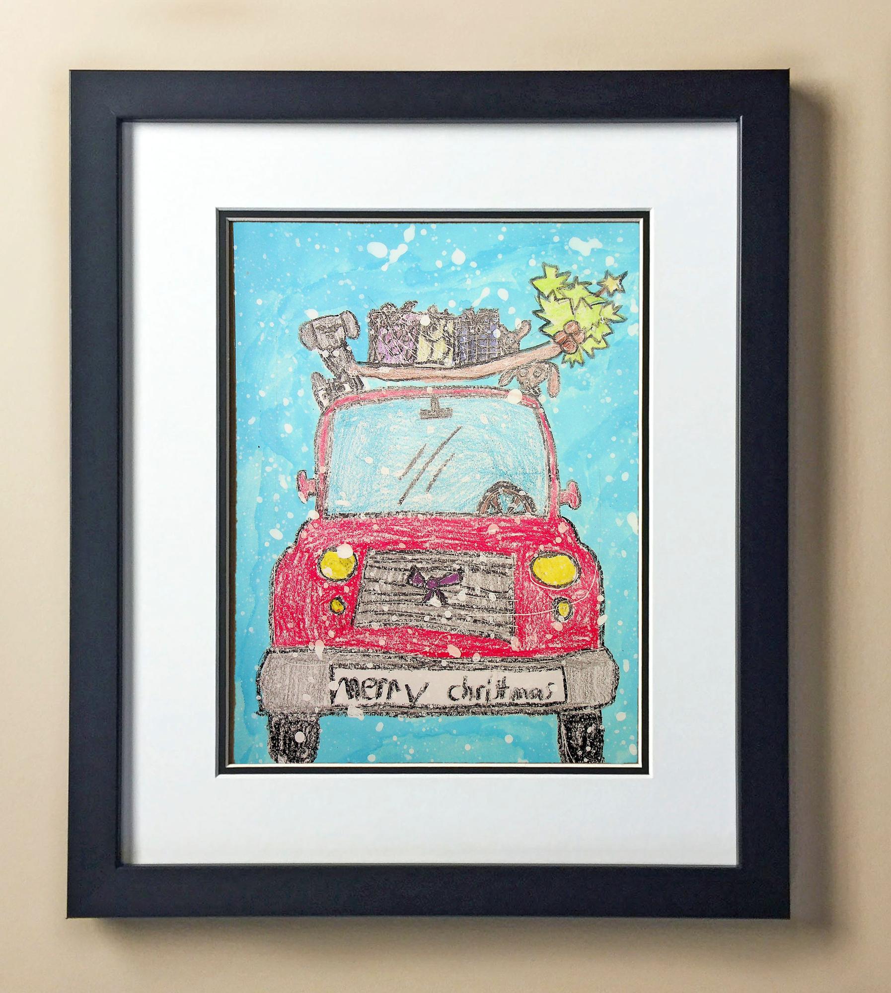 Included with the purchase is the Students Artwork, Frame, double matboard, shatter proof plexiglass, and a ready to hang backerboard with turnbuttons