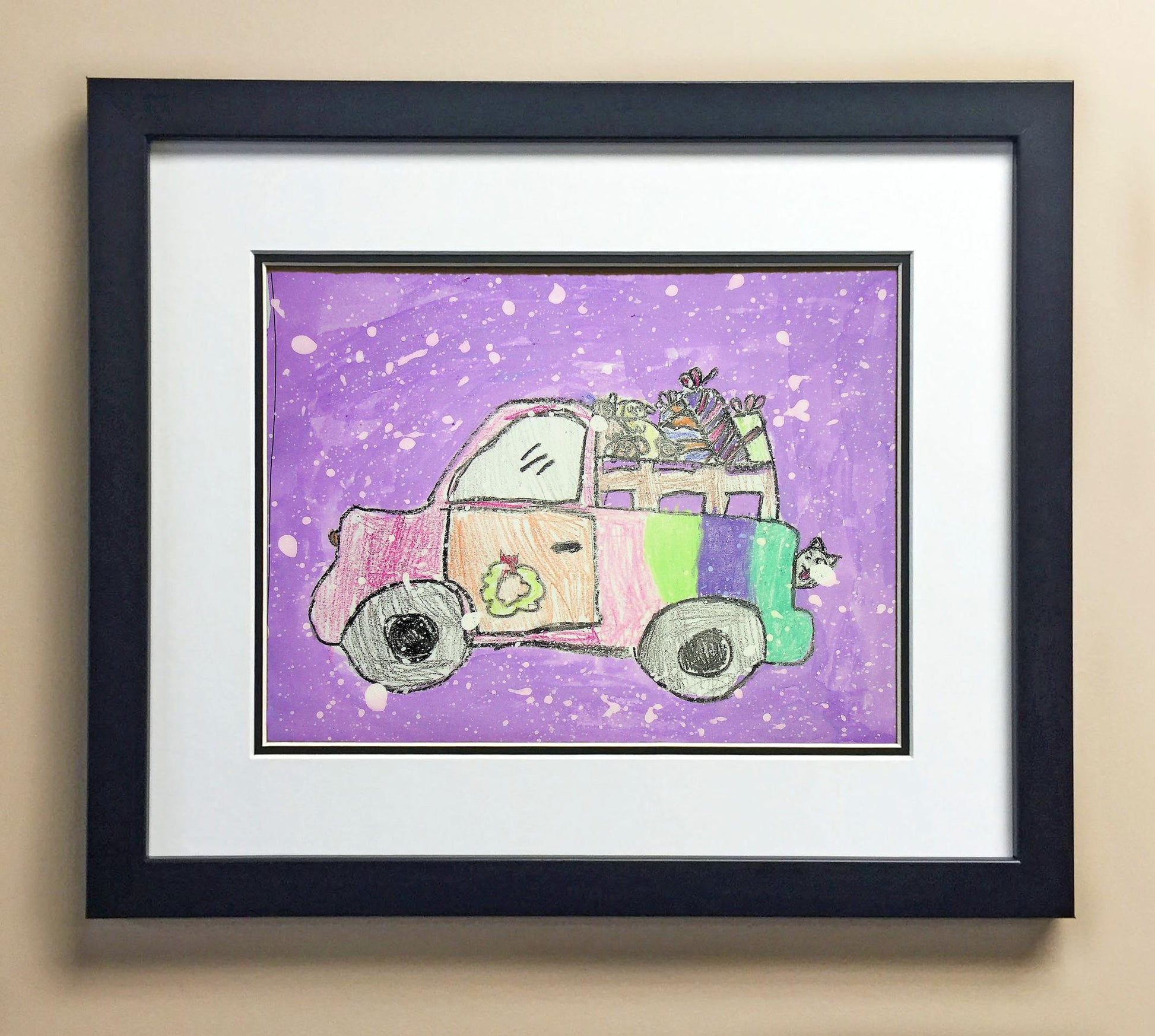 Included with the purchase is the Students Artwork, Frame, double matboard, shatter proof plexiglass, and a ready to hang backerboard with turnbuttons